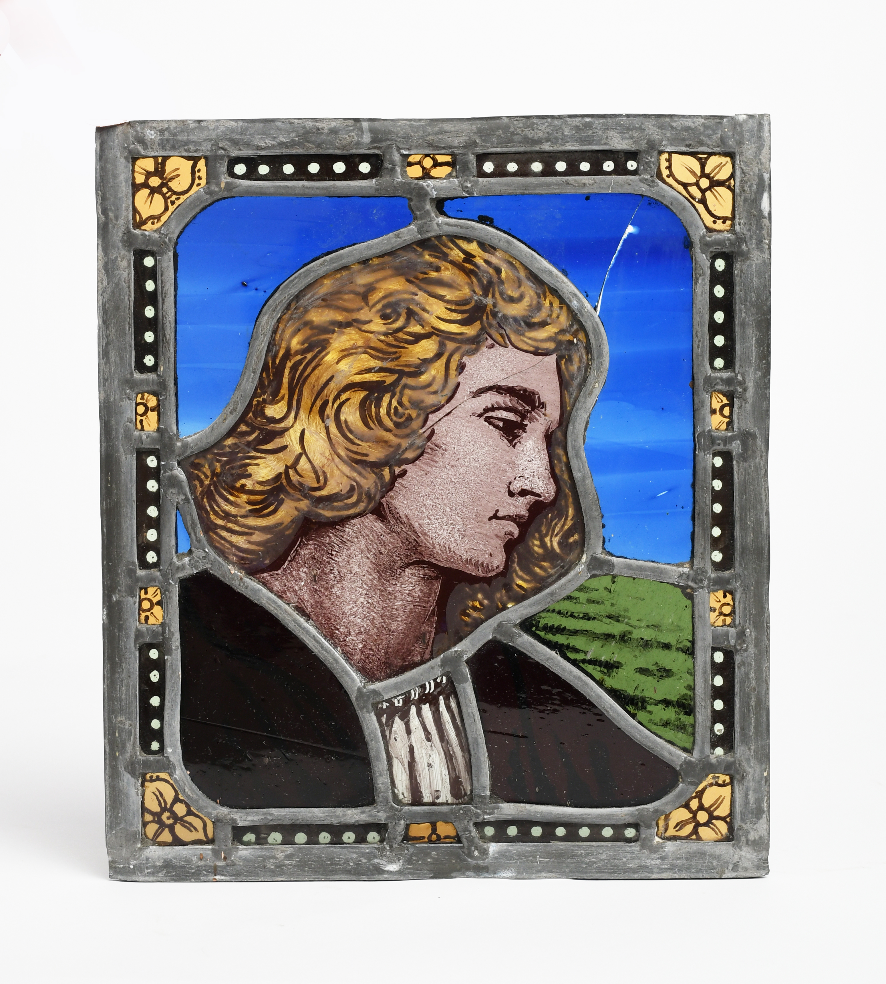 This small stained glass panel by Harry Mileham (1873-1957) is a detail of a full sized window made in 1935 for St Andrew's Church Hove, depicting King David the musician / harpist. It was in memory of H. W. Yeats, violinist.