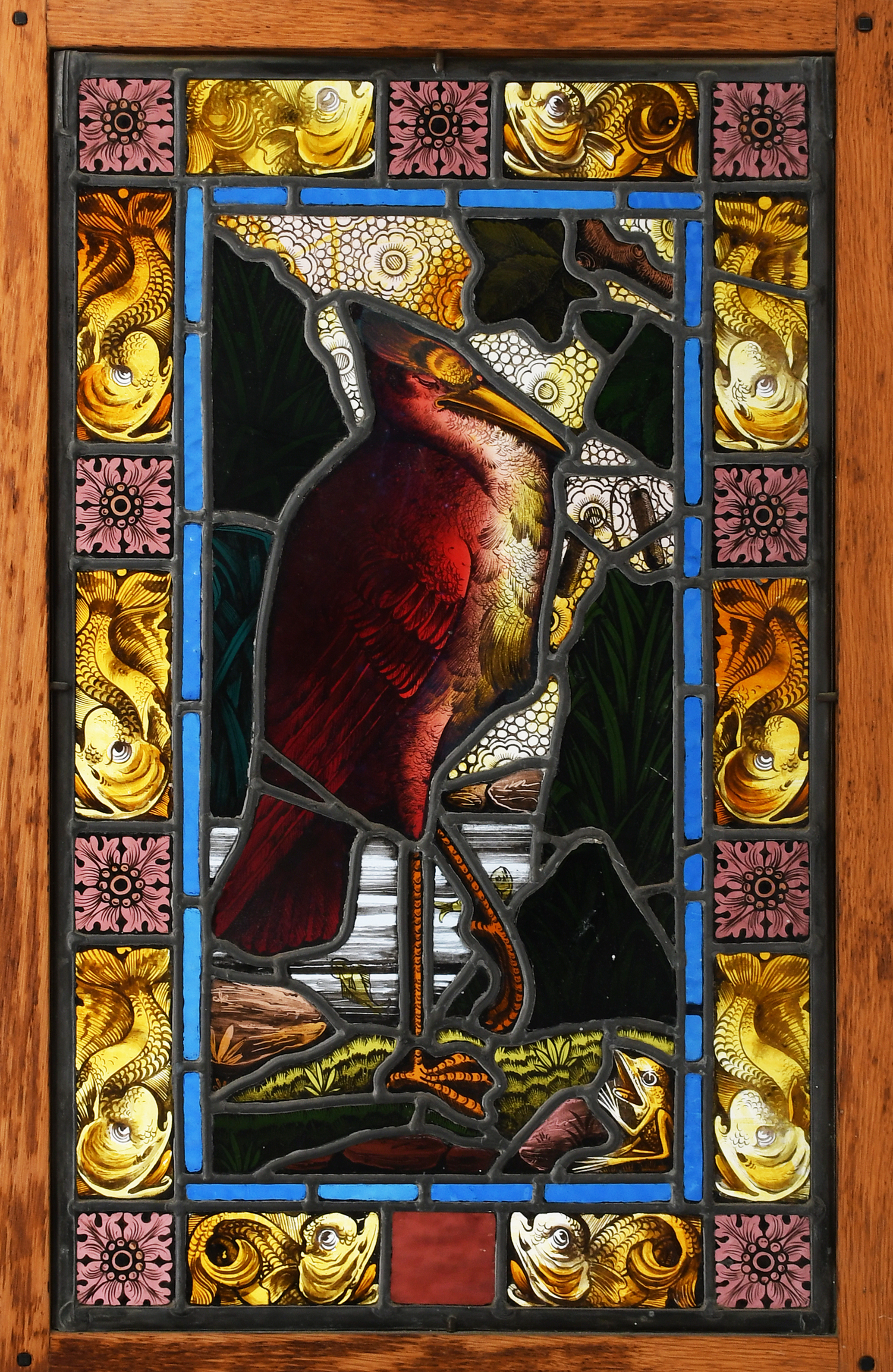An Aesthetic Movement stained glass window the design attributed to George Edward Cook, rectangular, decorated with a crane standing before a frog, fish swimming in the water in the distance, inside a border of scaly fish and square foliage quarries, inside an oak and ebony frame made by Peter Cornish, unsigned, 65 x 42cm.