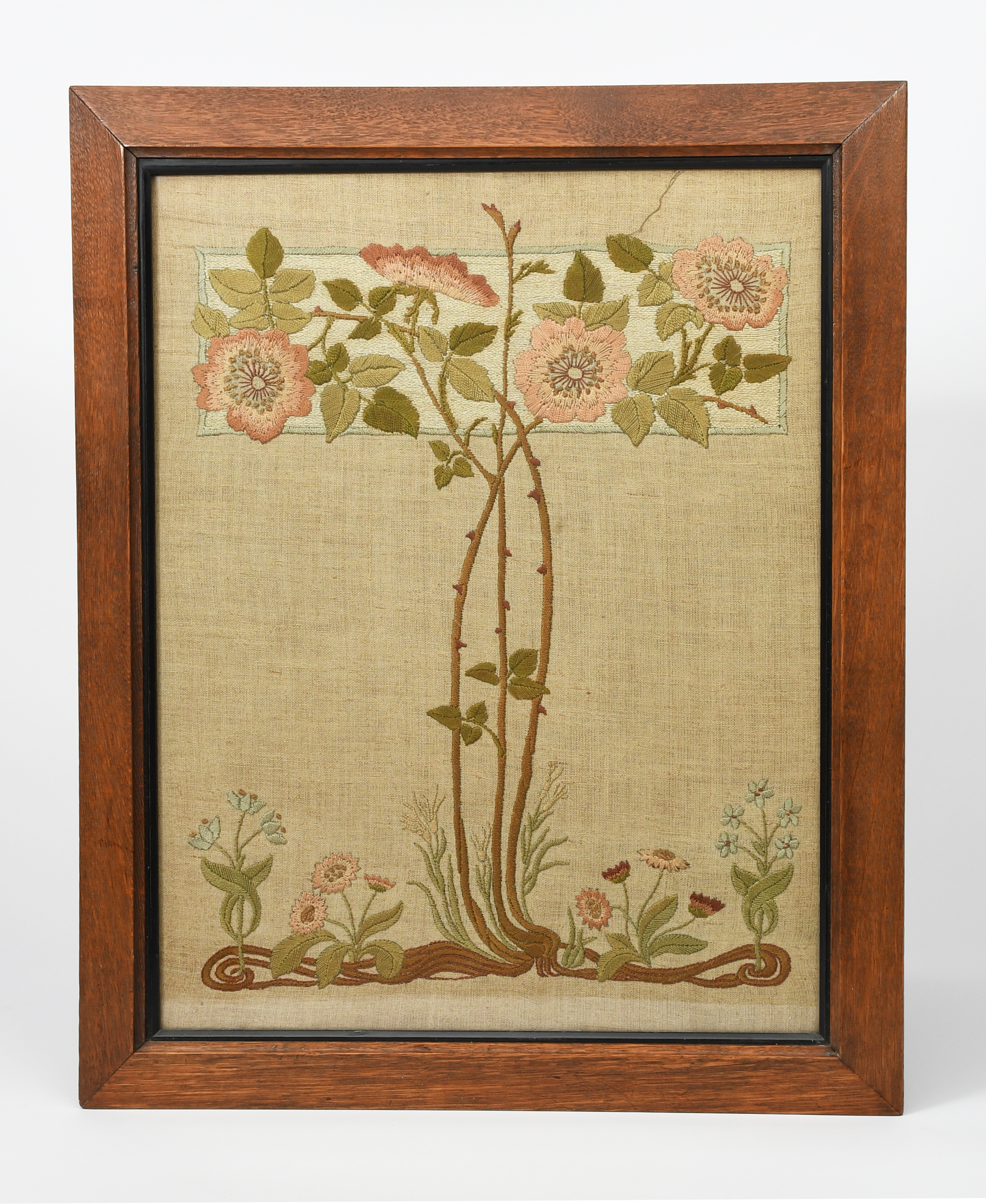An Art Nouveau silk embroidery possibly retailed by Liberty & Co, rectangular, embroidered with dog rose flowers on long entwined thorny stems, in oak frame, unsigned, 66 x 54cm. (frame)