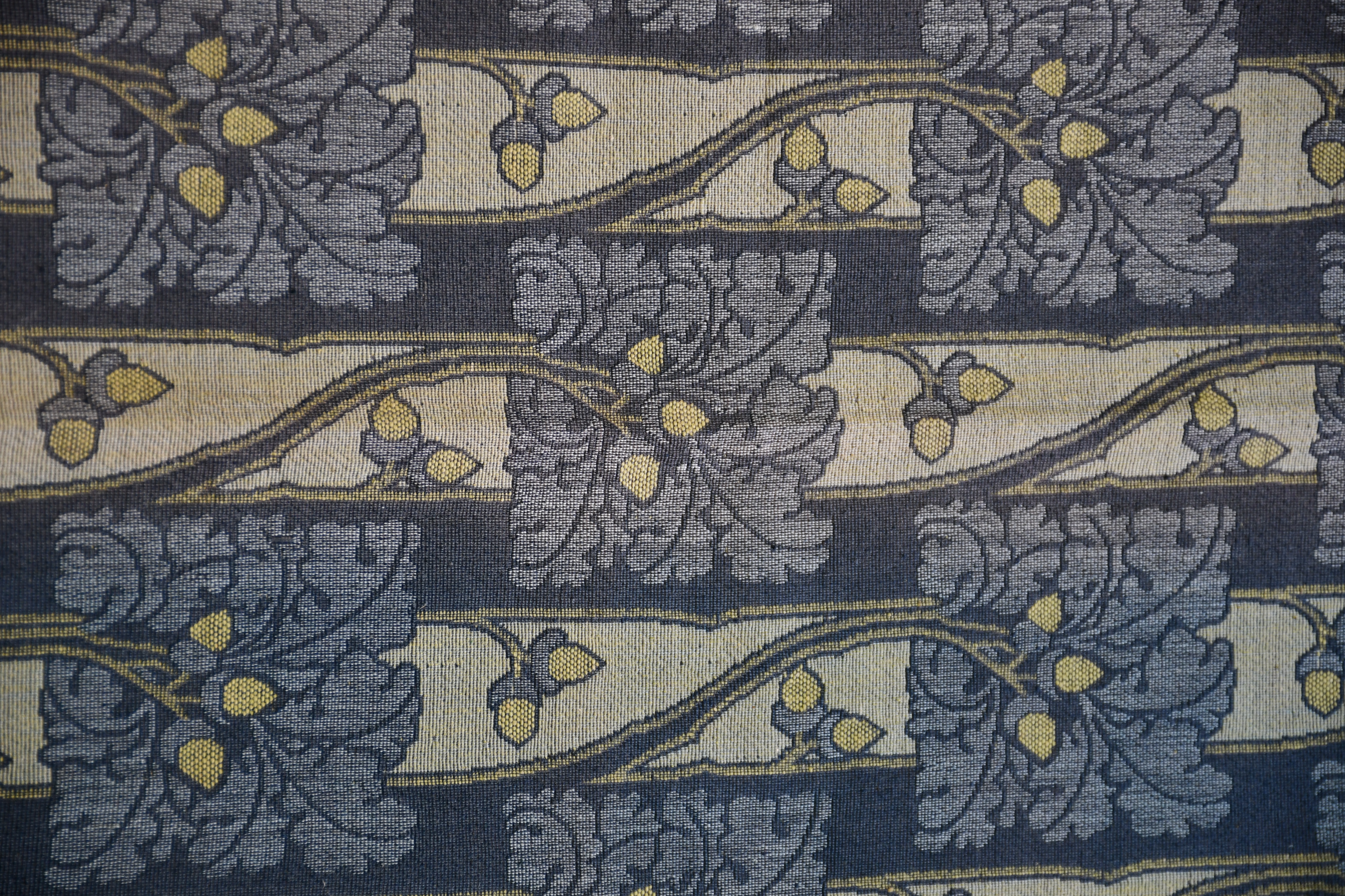 A woven textile portiere, decorated with acorn and oak leaf repeat in yellow, green and blue, unsigned, 235 x 117cm.