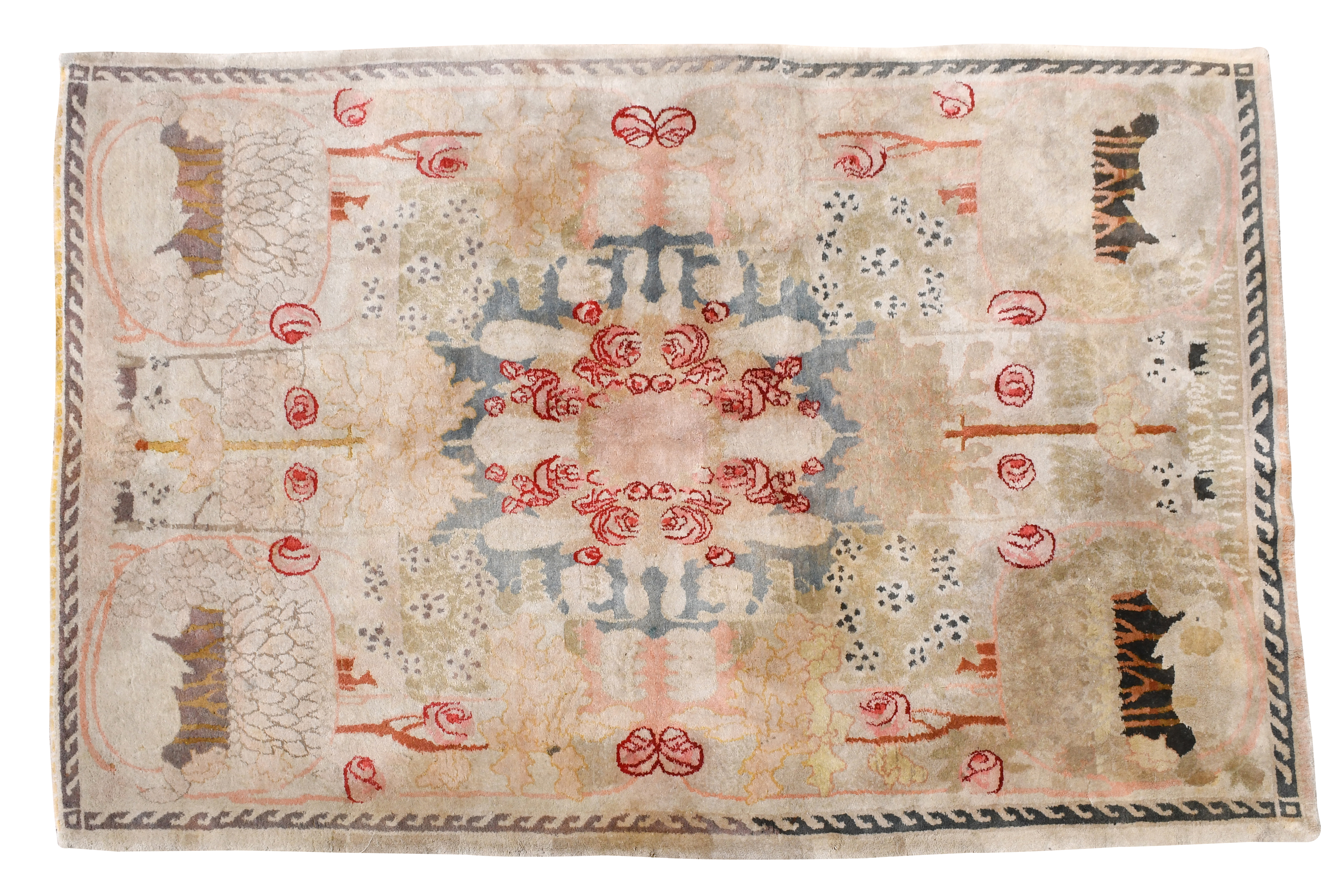 A large woven rug in the manner of Mackay Hugh Baillie Scott, rectangular with central standard rose motif, above stylised trees, each corner with a grazing rabbit unsigned, 303 x 217cm