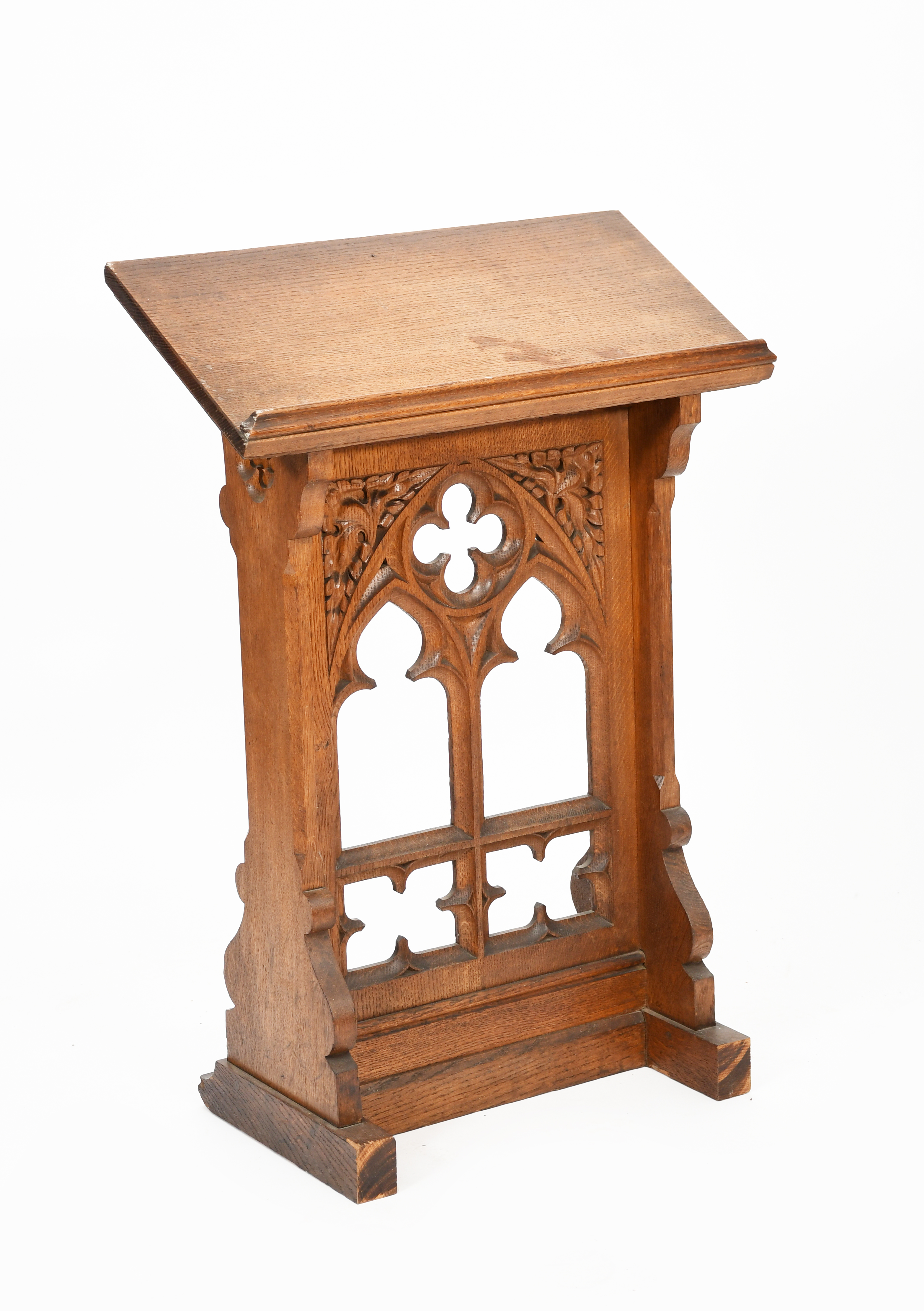 A Gothic Revival oak lectern, with carved tracery design, unsigned, 90cm. high, 61cm wide