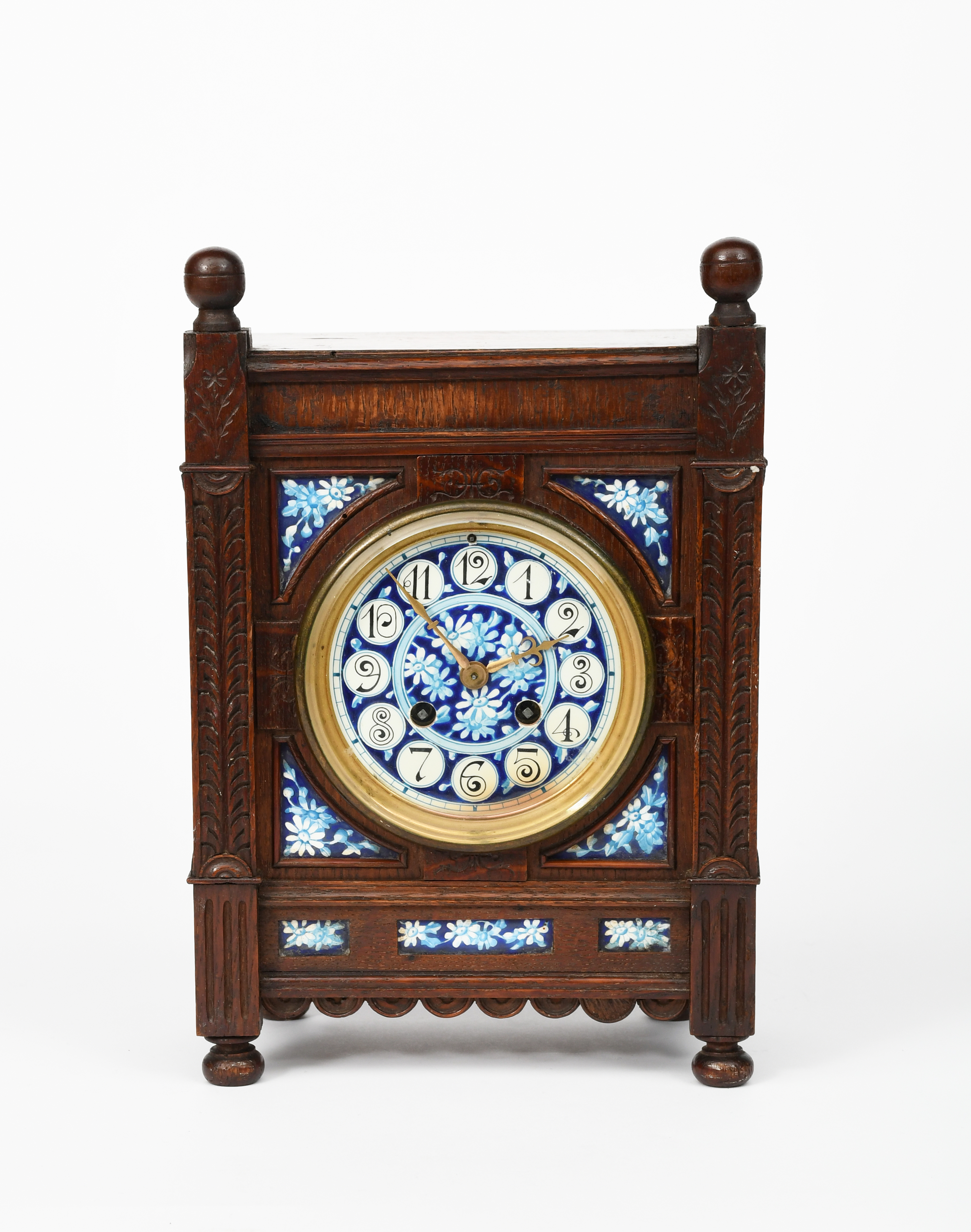 An Aesthetic Movement oak mantel clock the design attributed to Lewis F Day, rectangular with carved pillars, on bun feet, applied with enamelled ceramic panels and circular dial decorated with white daisy flowers, Arabic numerals, unsigned, 30cm. high