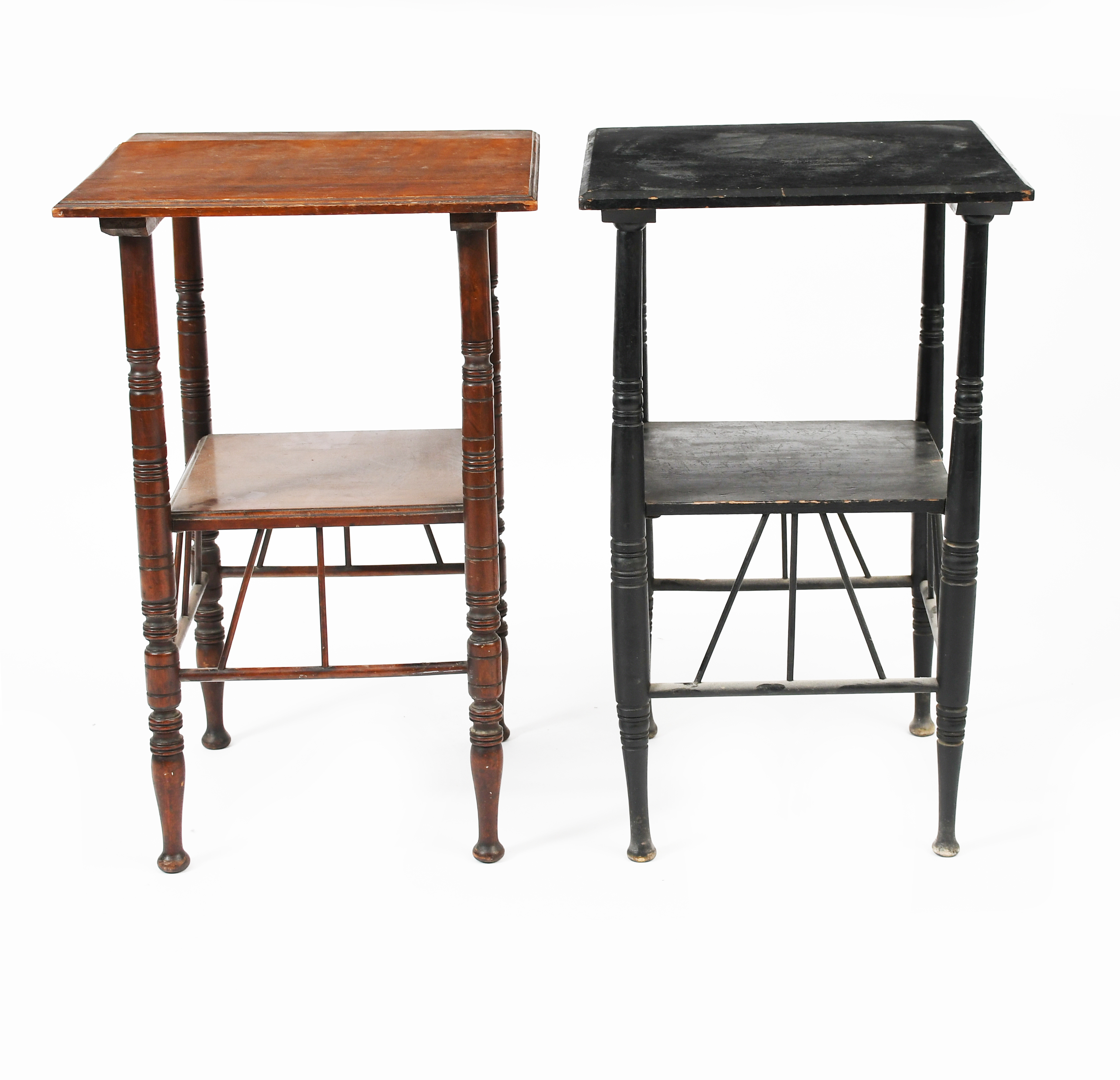 An Aesthetic Movement ebonised wood occasional table originally designed by E W Godwin, square section on turned legs, another similar table and an ebonised wood stool, unsigned, 66cm high, 40cm square top (3)