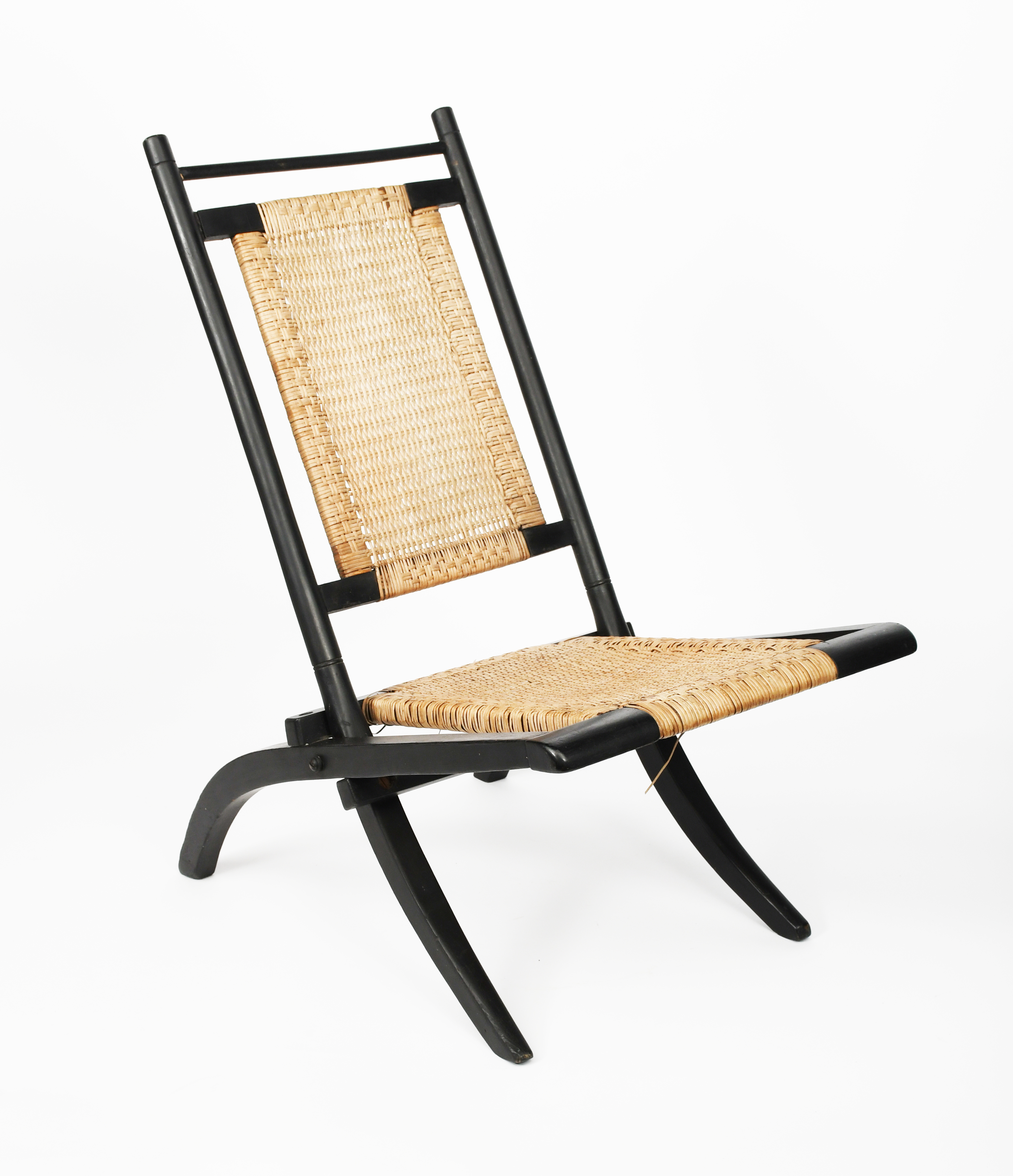 An Aesthetic Movement ebonised wood folding chair the design attributed to E W Godwin, with strung