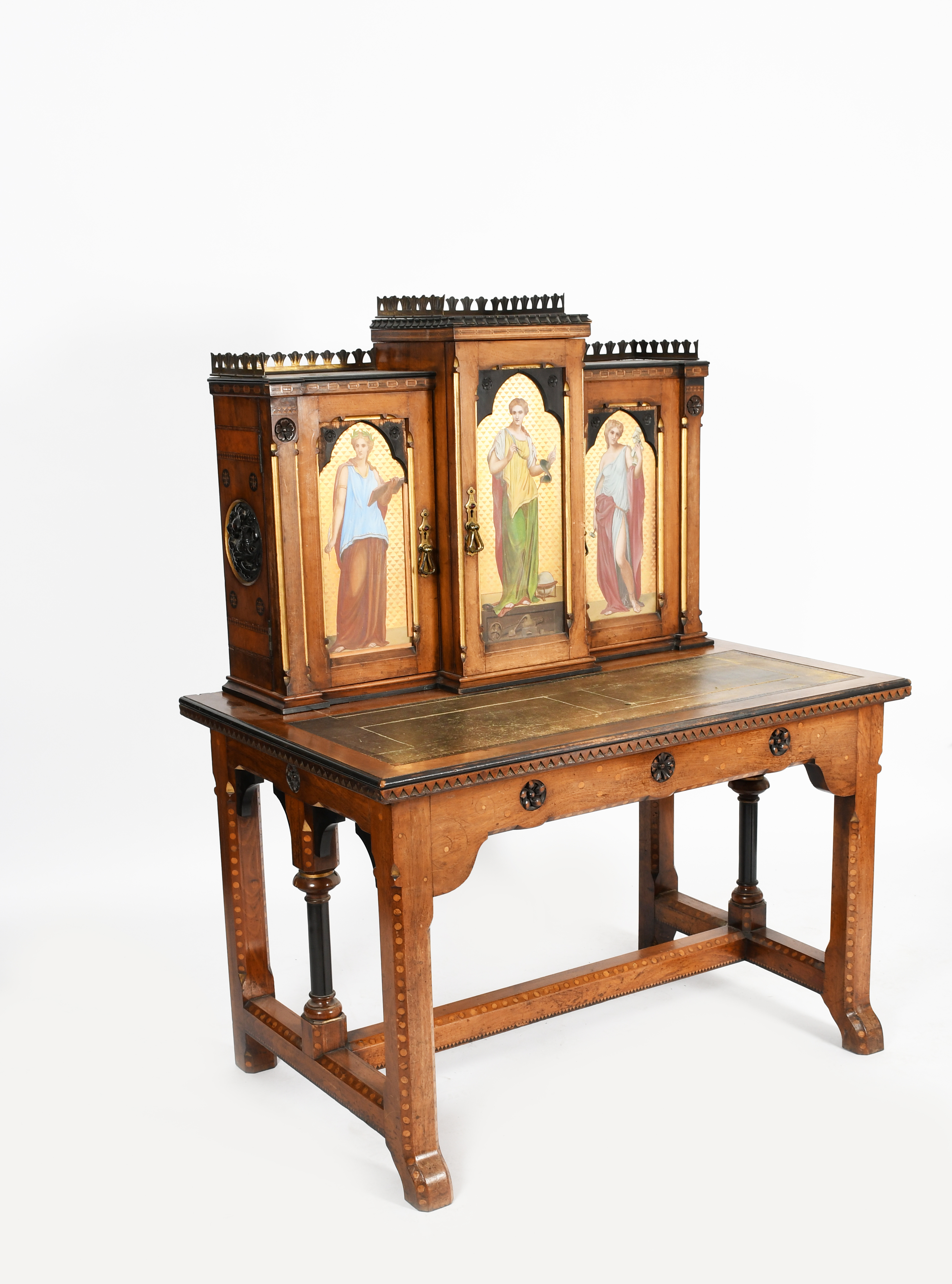An Aesthetic Movement oak desk, rectangular with leather top, on octagonal legs inlaid with circular panels, ebonised wood pillar and bracket supports, the top section with three single door compartments each with a painted allegorical female figure representing the arts, with fitted compartments, unsigned, 143cm. high, 114cm wide, 74cm deep.