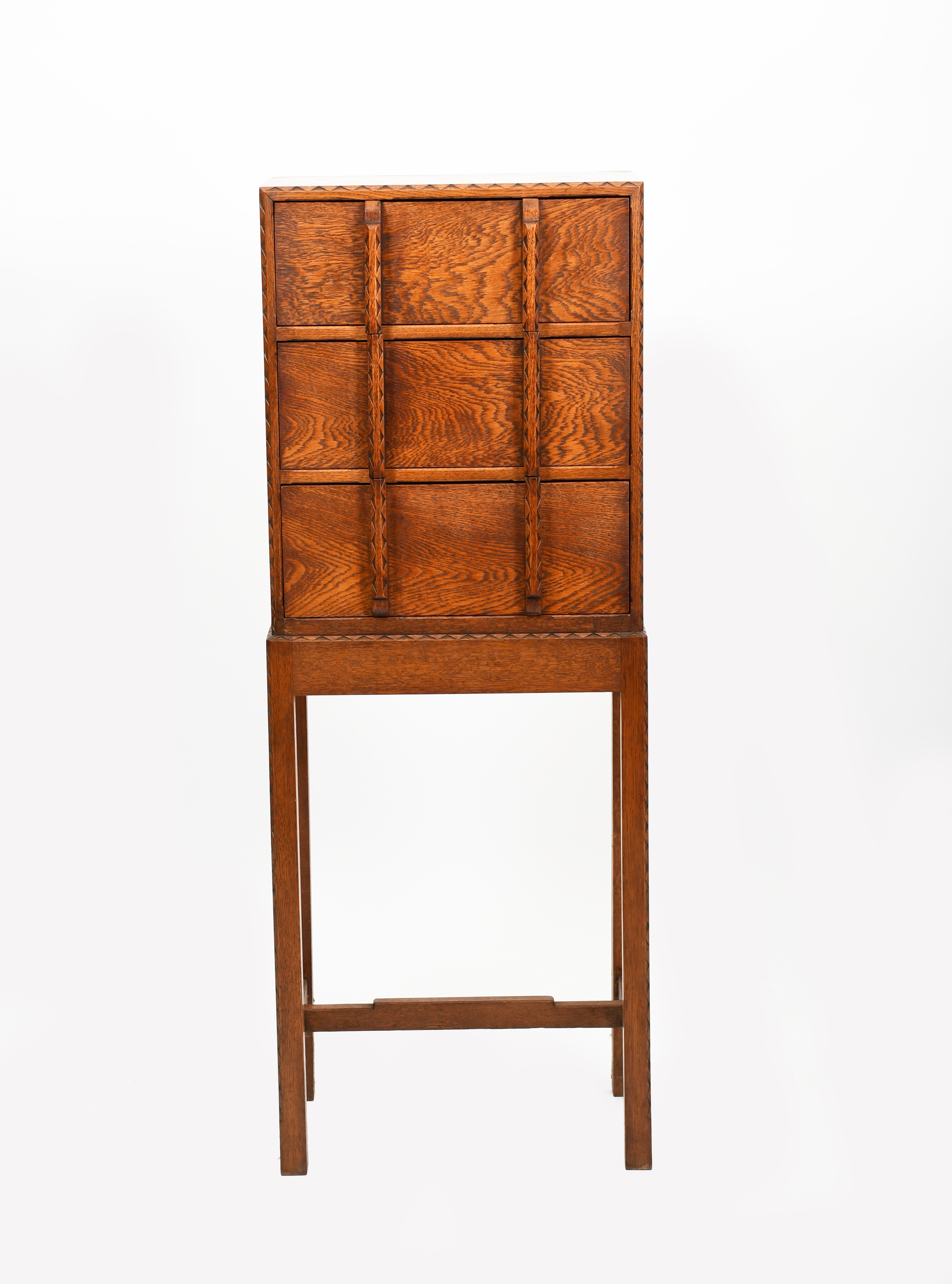 A Cotswold School English oak chest on stand, the rectangular section cabinet with three drawers, carved geometric bands and handles, square section legs with stepped stretcher, unsigned, 123cm. high, 45.5 x 27cm.