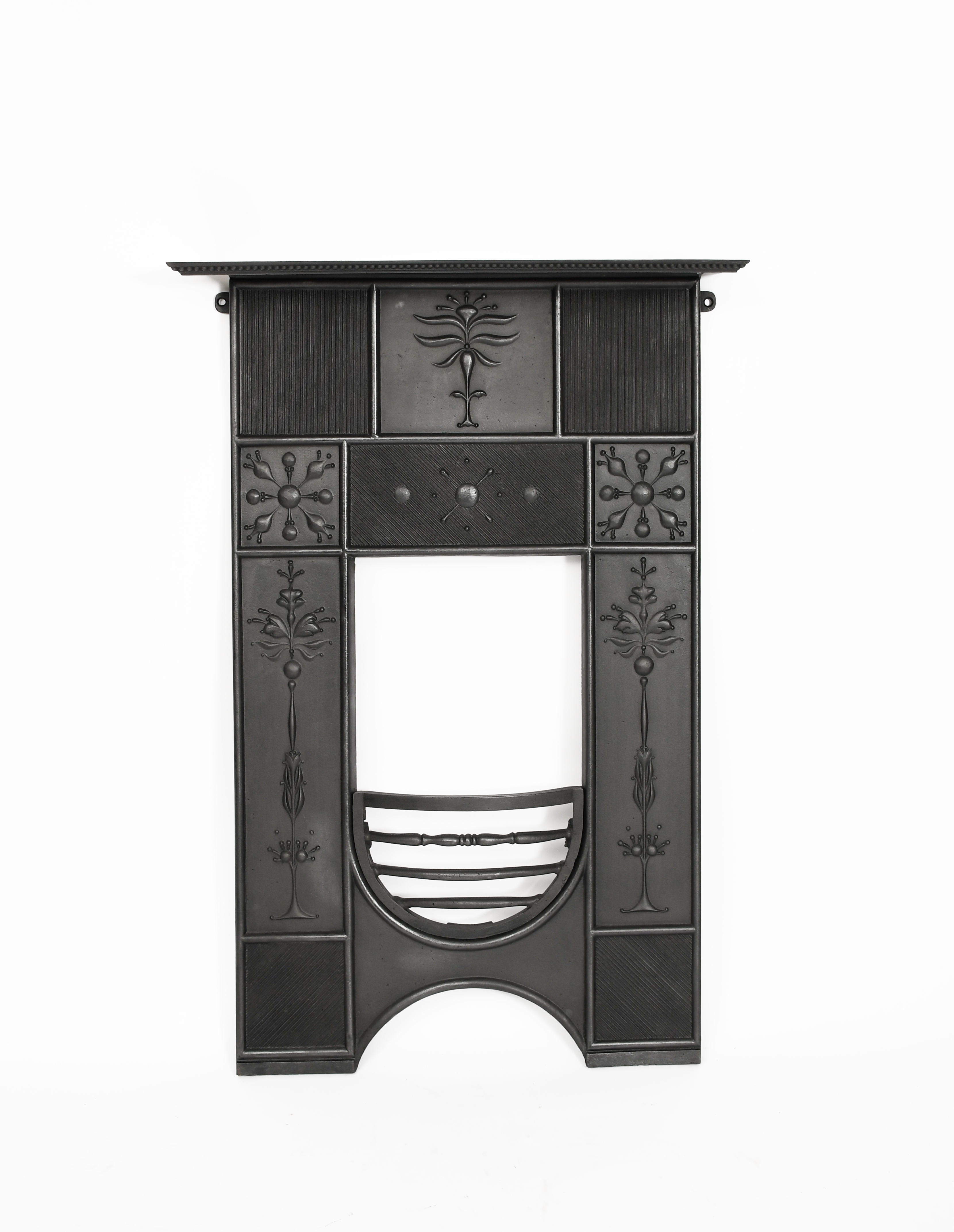 A Falkirk cast-iron fireplace designed by Charles Robert Ashbee, rectangular, cast in low relief
