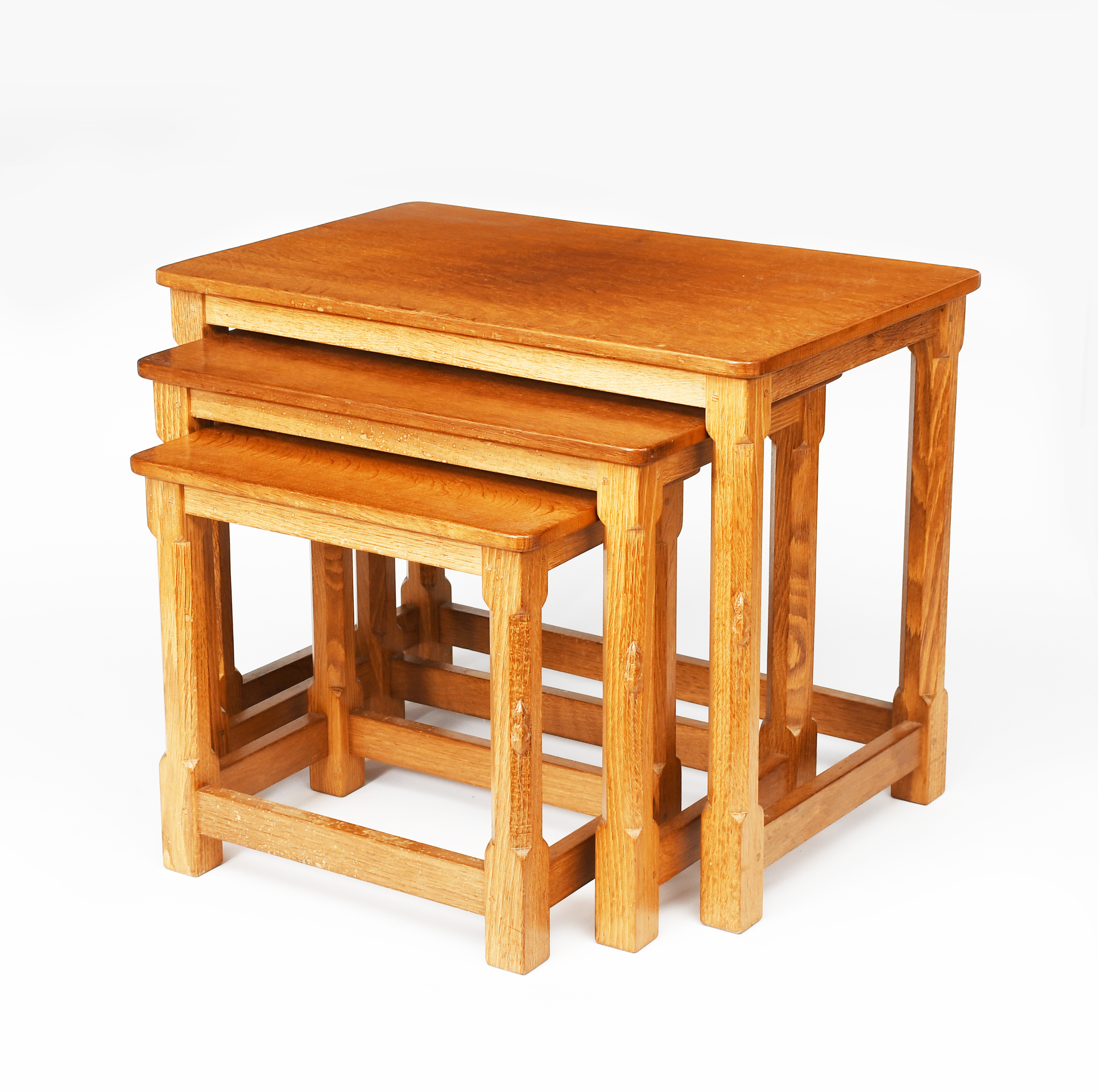 A Robert Mouseman Thompson oak nest of tables, each with rectangular section with adzed finish, the