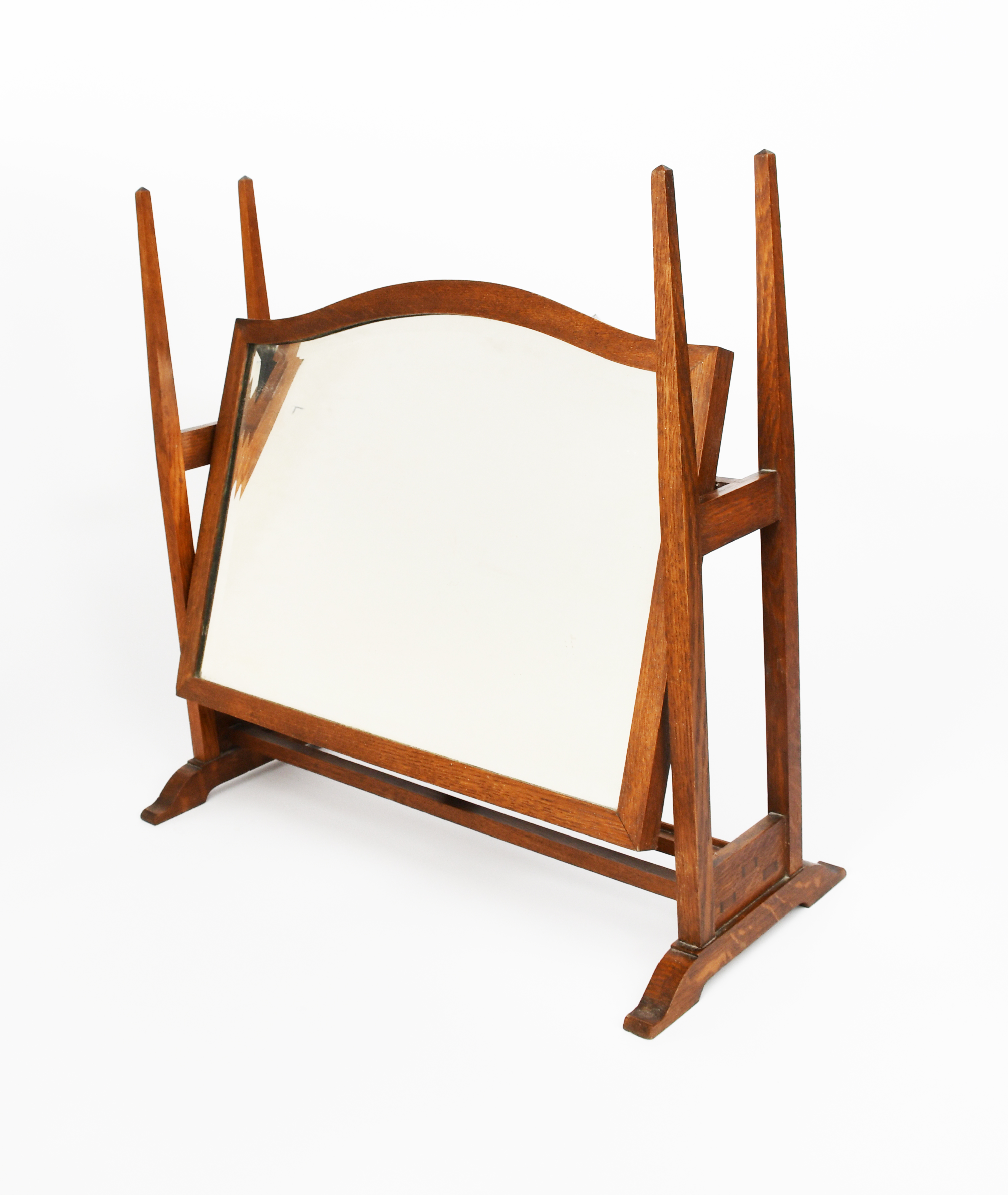 An Arthur W Simpson's of Kendal oak dressing table mirror in the manner of Charles Francis Annesley Voysey, the arched, rectangular mirror supported on four tapering square obelisk, on arched feet, unsigned, 57cm. high, 56cm. wide