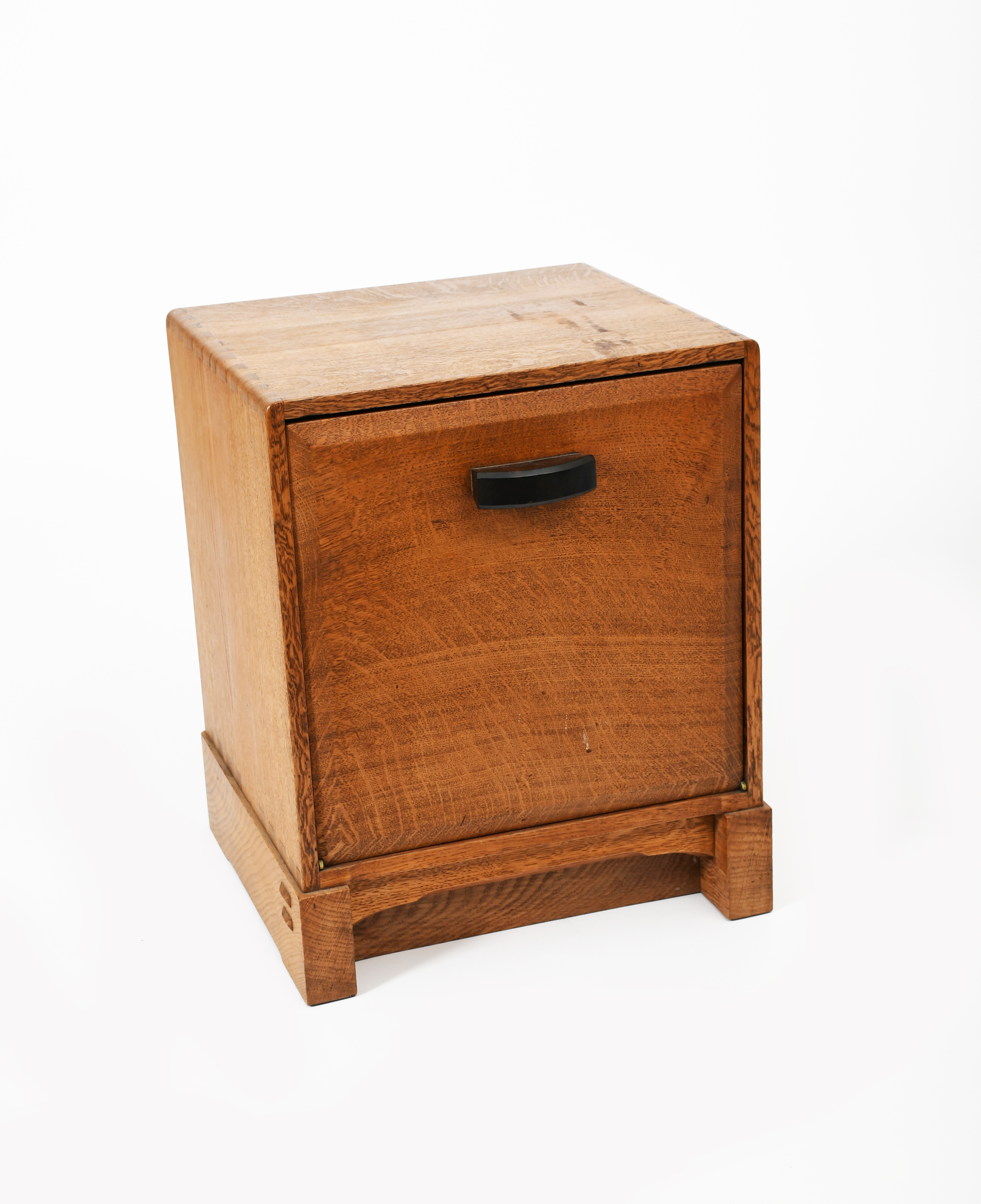 An oak coal box the design attributed to Stanley Webb Davies, rectangular with ebonised wood handle, with fall front, fitted tin interior, unsigned, 52cm high, 41cm wide
