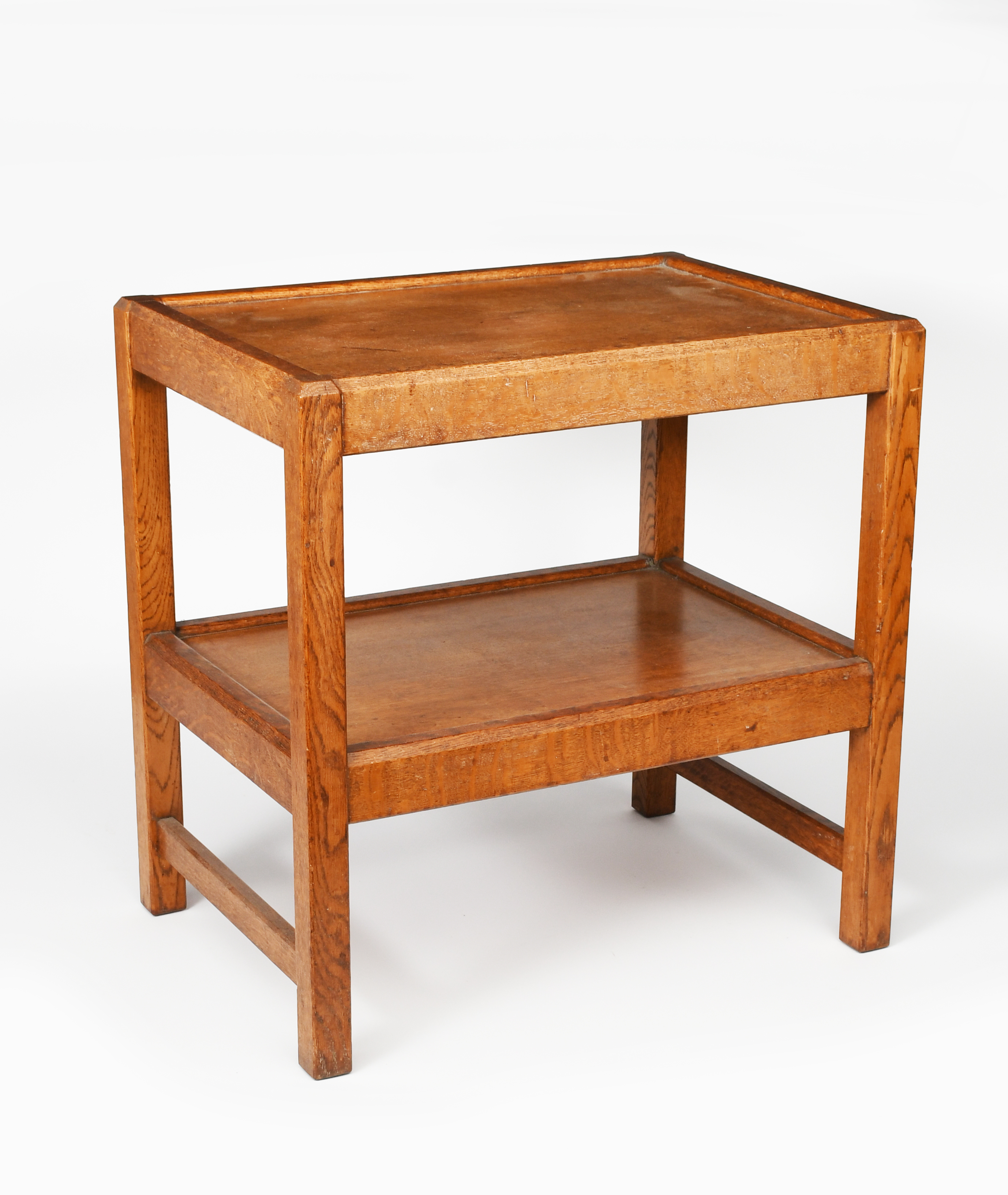 A Gordon Russell Ltd Japanese oak trolley table designed by Gordon Russell, design 628 3073, dated 1930, made by C Gough, rectangular section, with lower shelf, the square section legs with castor brackets, applied paper label, castors missing, 60 x 42cm, 61cm. high