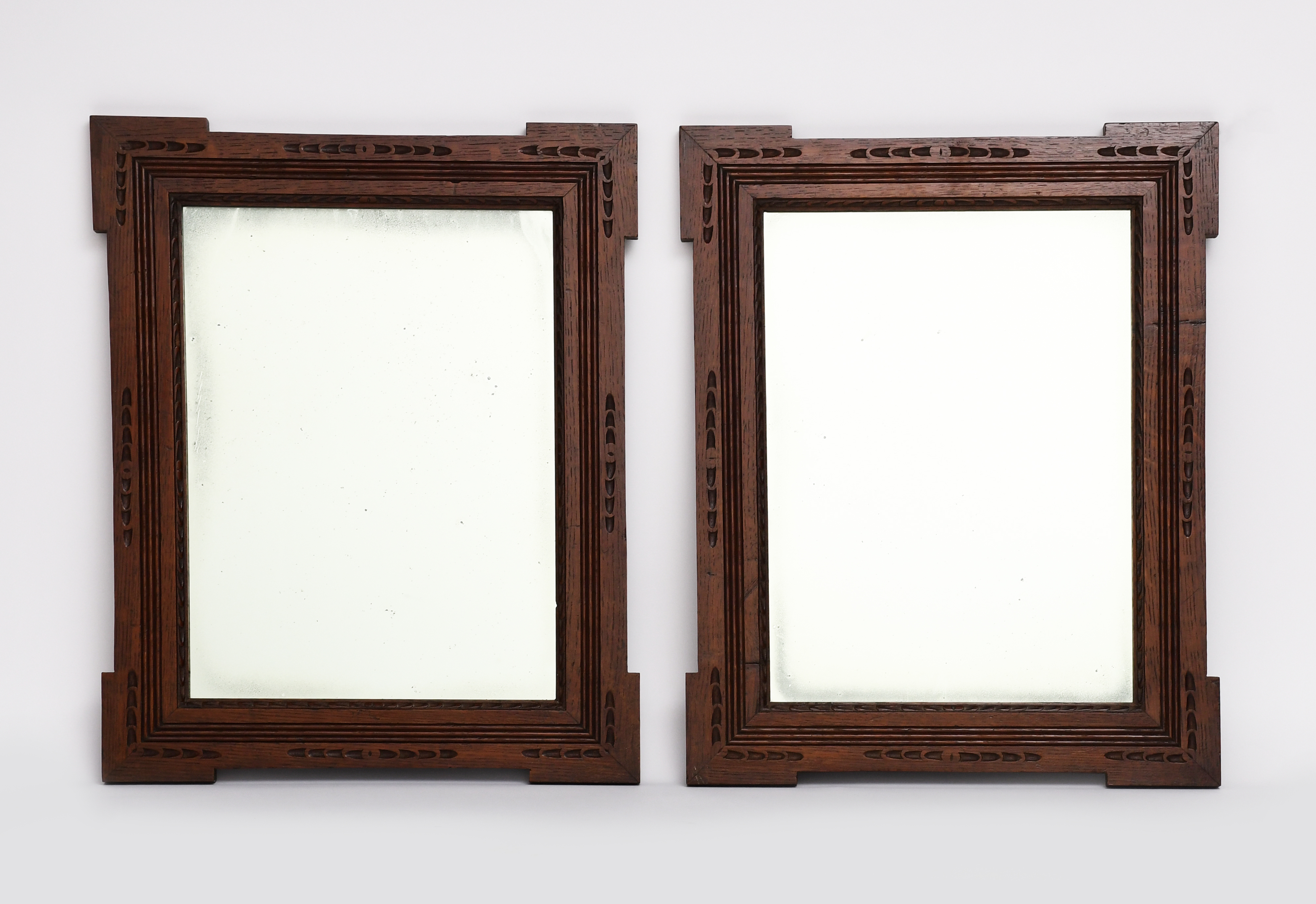 A pair of Liberty & Co oak wall mirrors, shaped, rectangular form with chip-carved decoration,