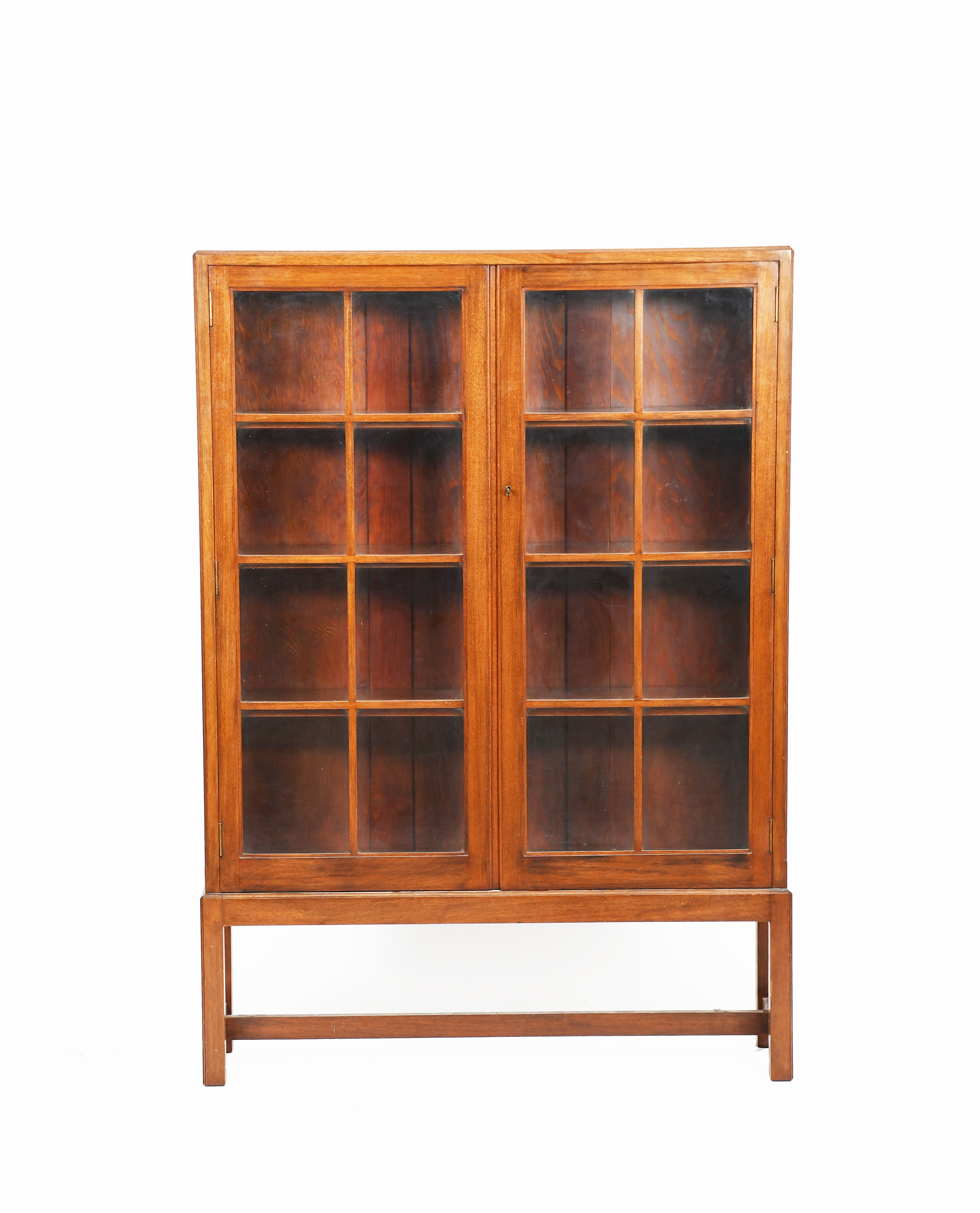 A Heal's mahogany glazed display cabinet, rectangular with glazed panel doors, applied Heal's ivorine label, 130cm. high, 91cm wide, 26cm deep
