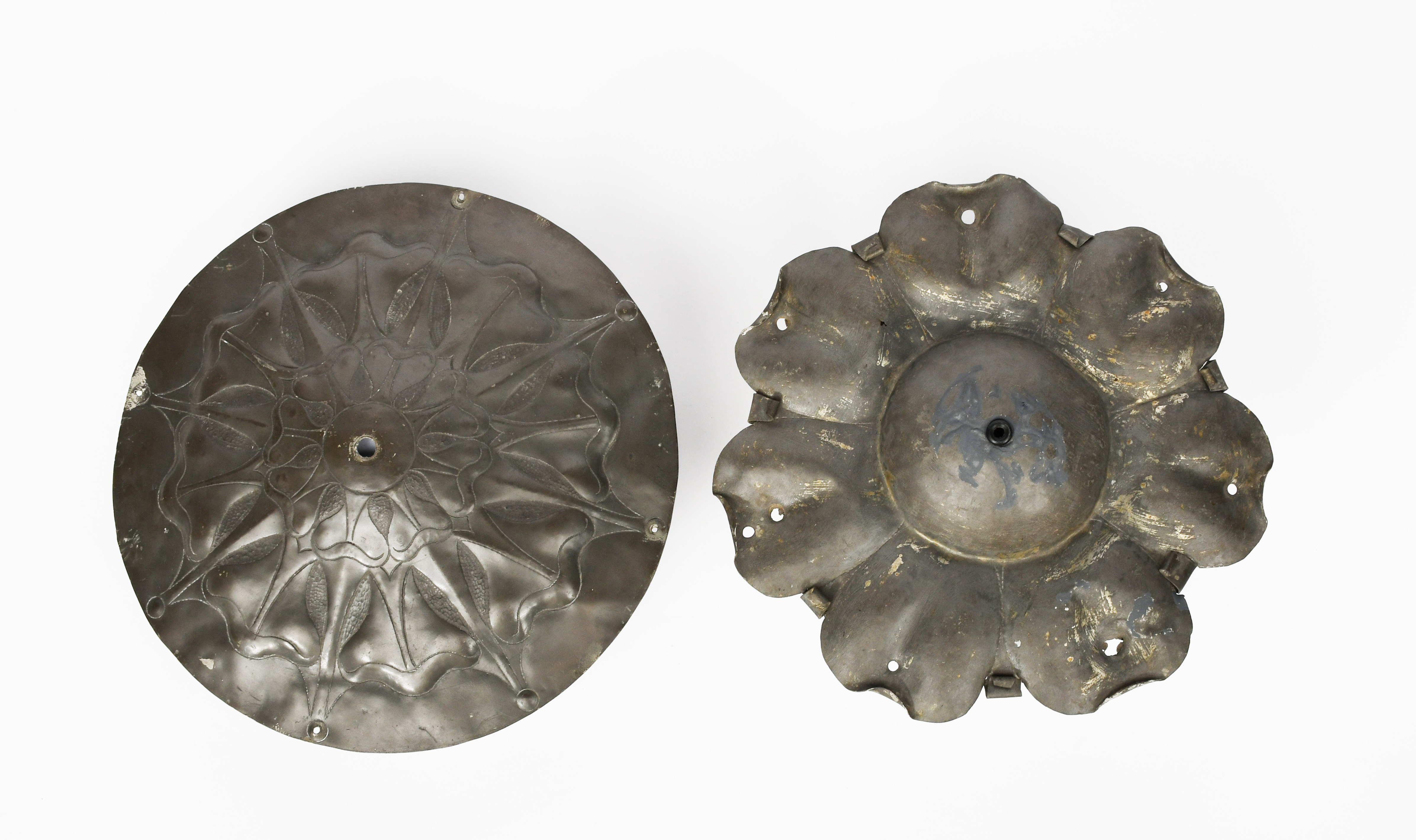 A rare Guild of Handicraft pewter ceiling rose designed by Charles Robert Ashbee for the Magpie and Stump, circular, stamped with Tudor rose flower head, and another, possibly a pendulum shade modelled as a flower head the design attributed to Charles Robert Ashbee, unsigned, 31cm. diam. (2)