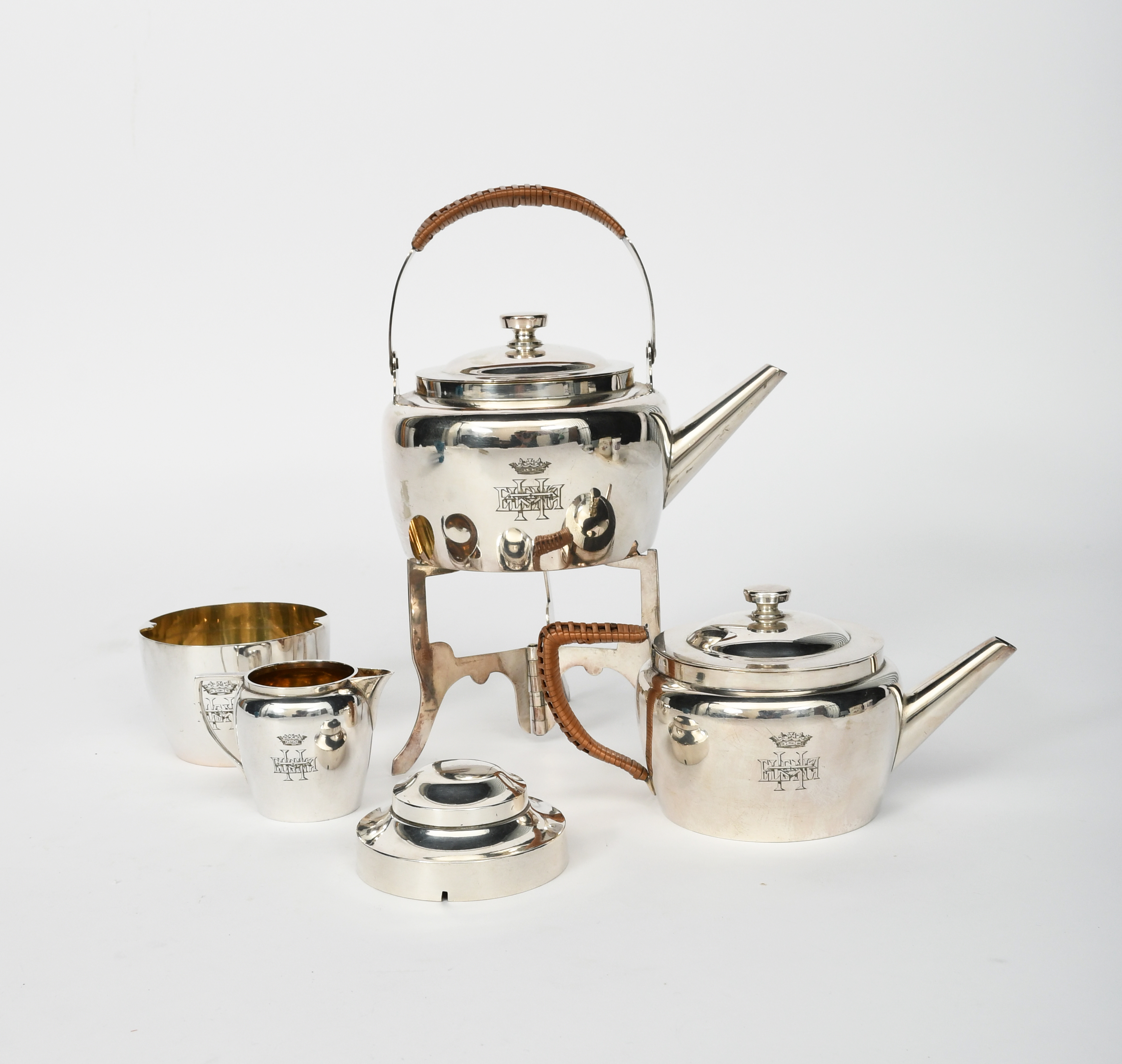 A Hukin and Heath electroplated metal Picnic tea set designed by Dr Christopher Dresser, model no.2109, comprising; teapot and cover, milk-jug and sugar basin, hot-water pot and cover, folding tripod and a petrol flask, the teapot engraved with coat of arms, stamped marks, designed by Dr C Dresser, 15.5cm. high (8)