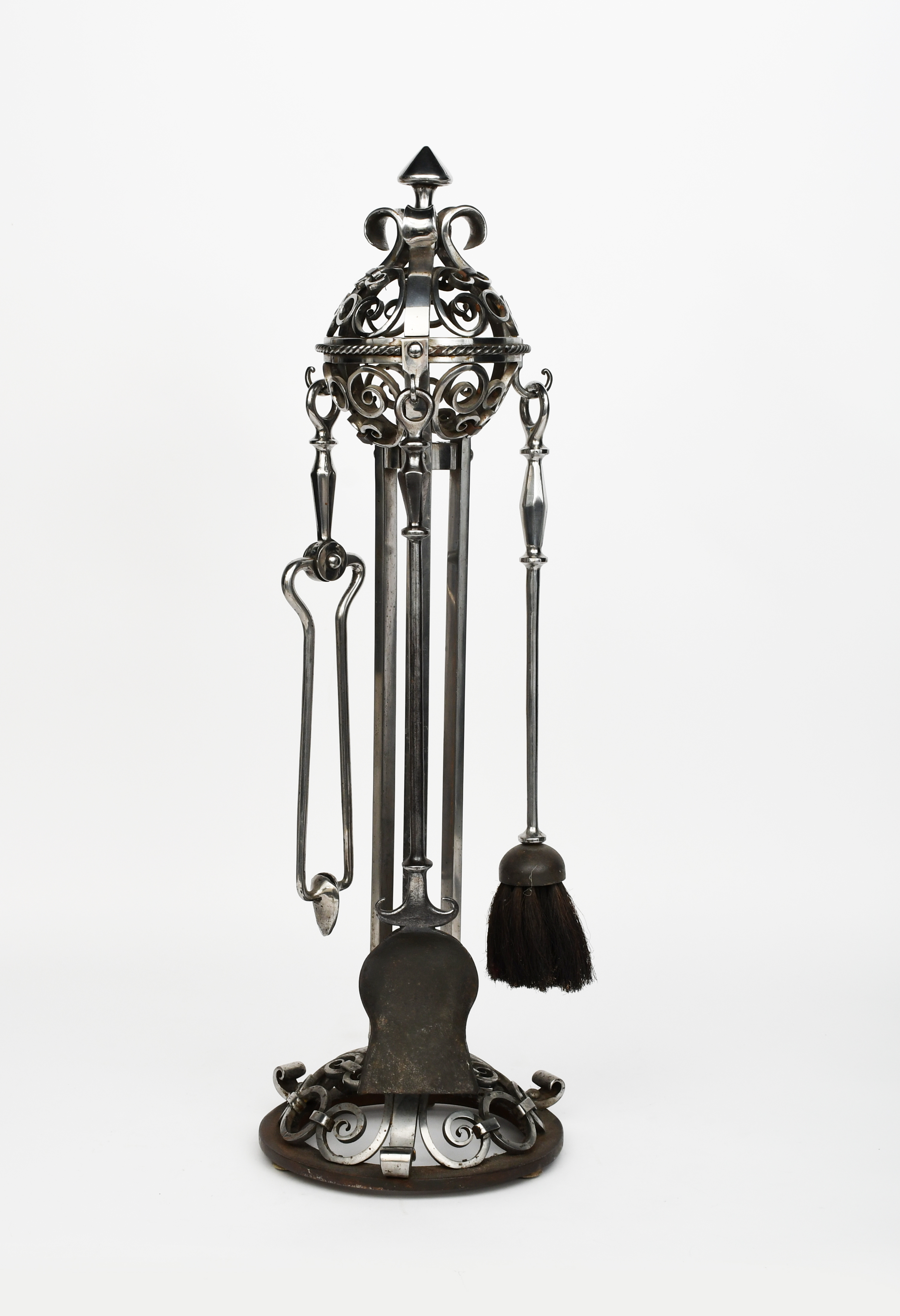 A Norman and Ernest Spittle polished steel fire tool set on stand, comprising shovel, brush and tongs, the central stand pierced scroll panels, on domed foot, unsigned, 80cm. high