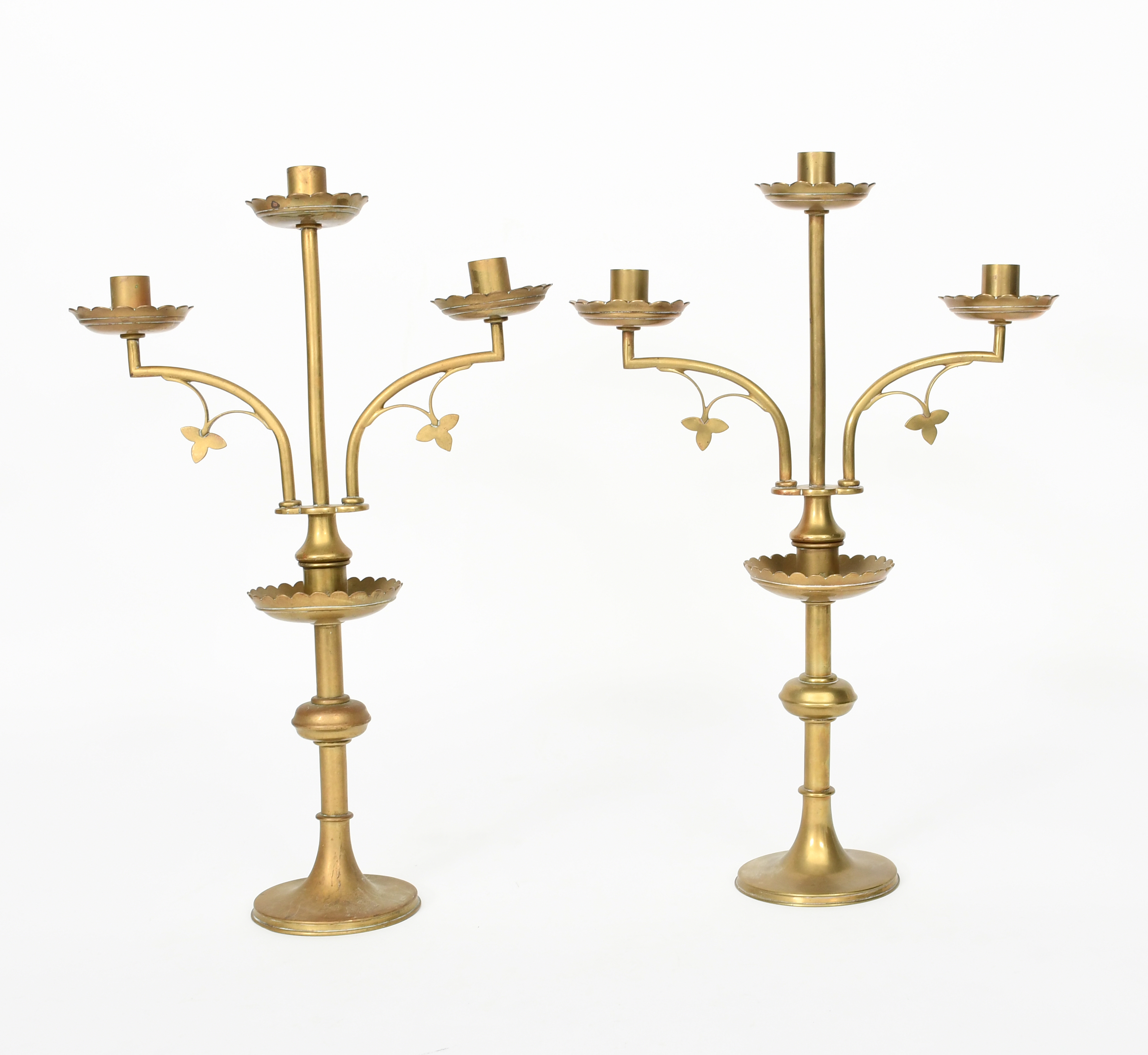 A pair of John Hardman & Co brass three branch candelabra, the knopped stem, with flaring