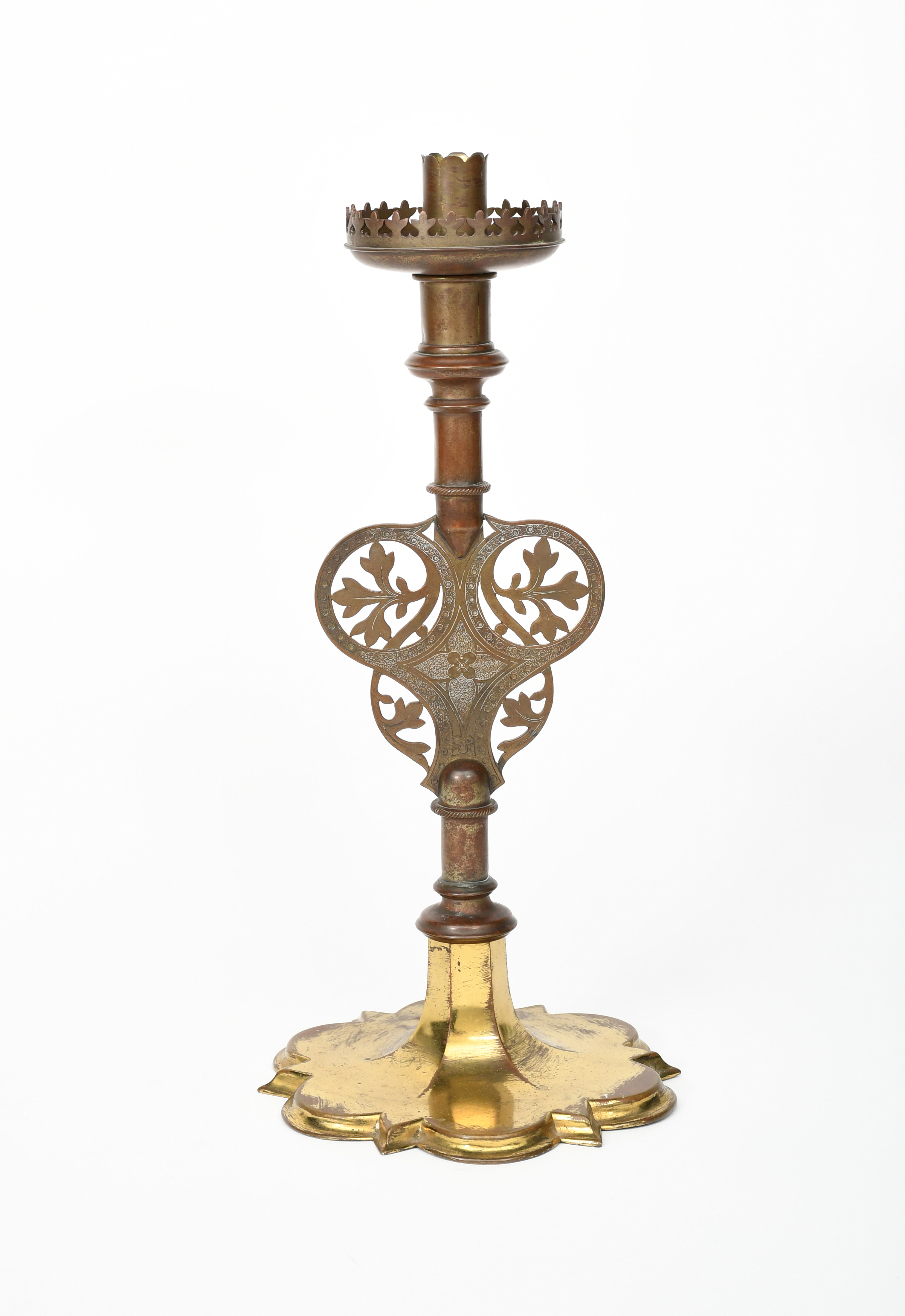A John Hardman & Co patinated and gilded brass candlestick designed by Augustus Welby Northmore Pugin, lobed gilt base tapering to central knopped column, pierced and worked with scrolling foliate panel, the sconce with trefoil gallery, unsigned, 42cm. high