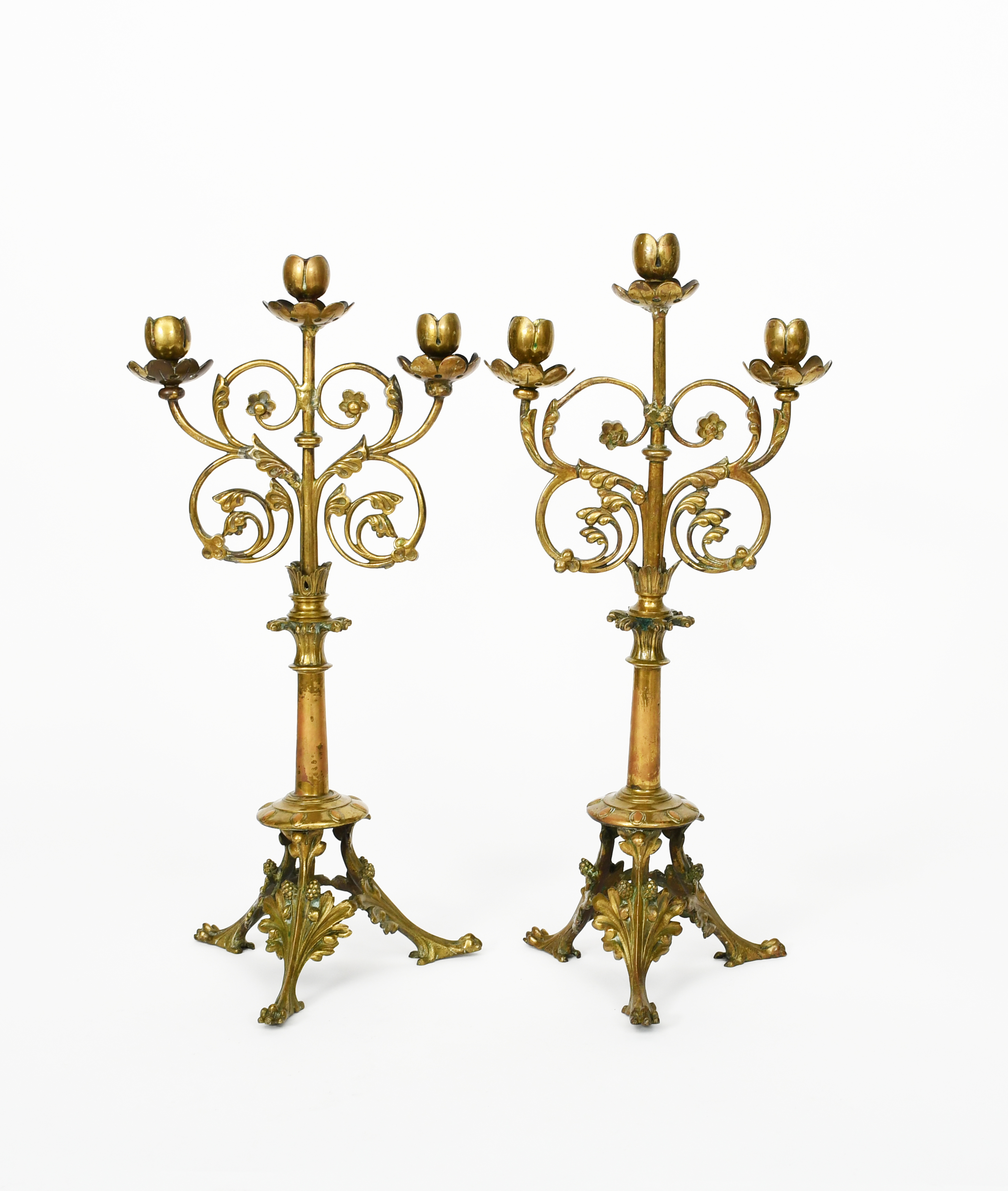 A pair of gilt bronze candlesticks the design attributed to Eugène Emmanuel Viollet Le Duc, for Poussielgue-Rusand, tripod foot supporting central column with scrolling foliage and three foliate sconce, unsigned, 49.5cm. high (2)