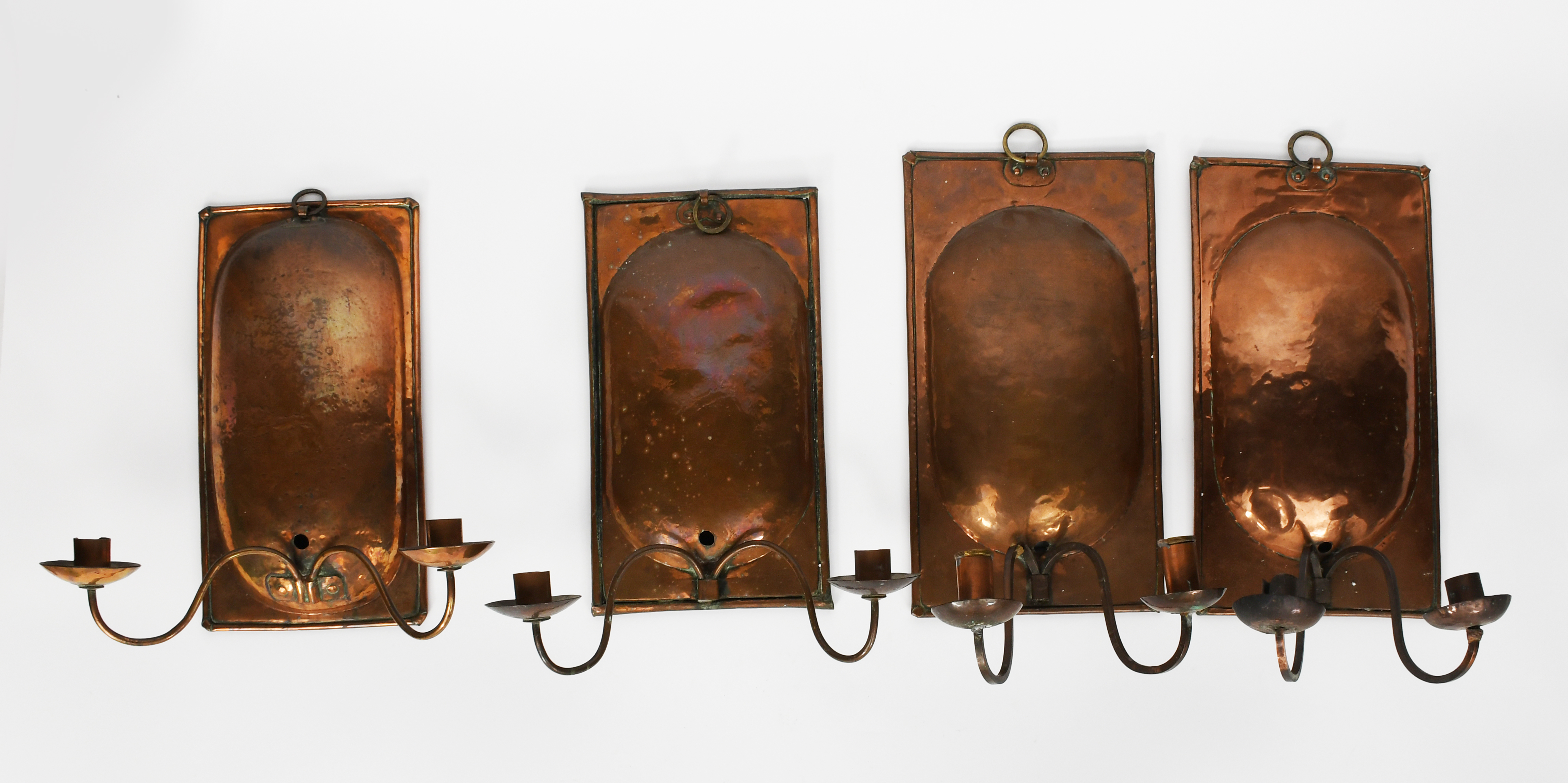 A set of four patinated copper wall sconces, each with rectangular backplate, stamped in relief with domed panel, applied scroll twin-branch candle sconces, unsigned, 40.5cm. high, 34cm. wide (4)