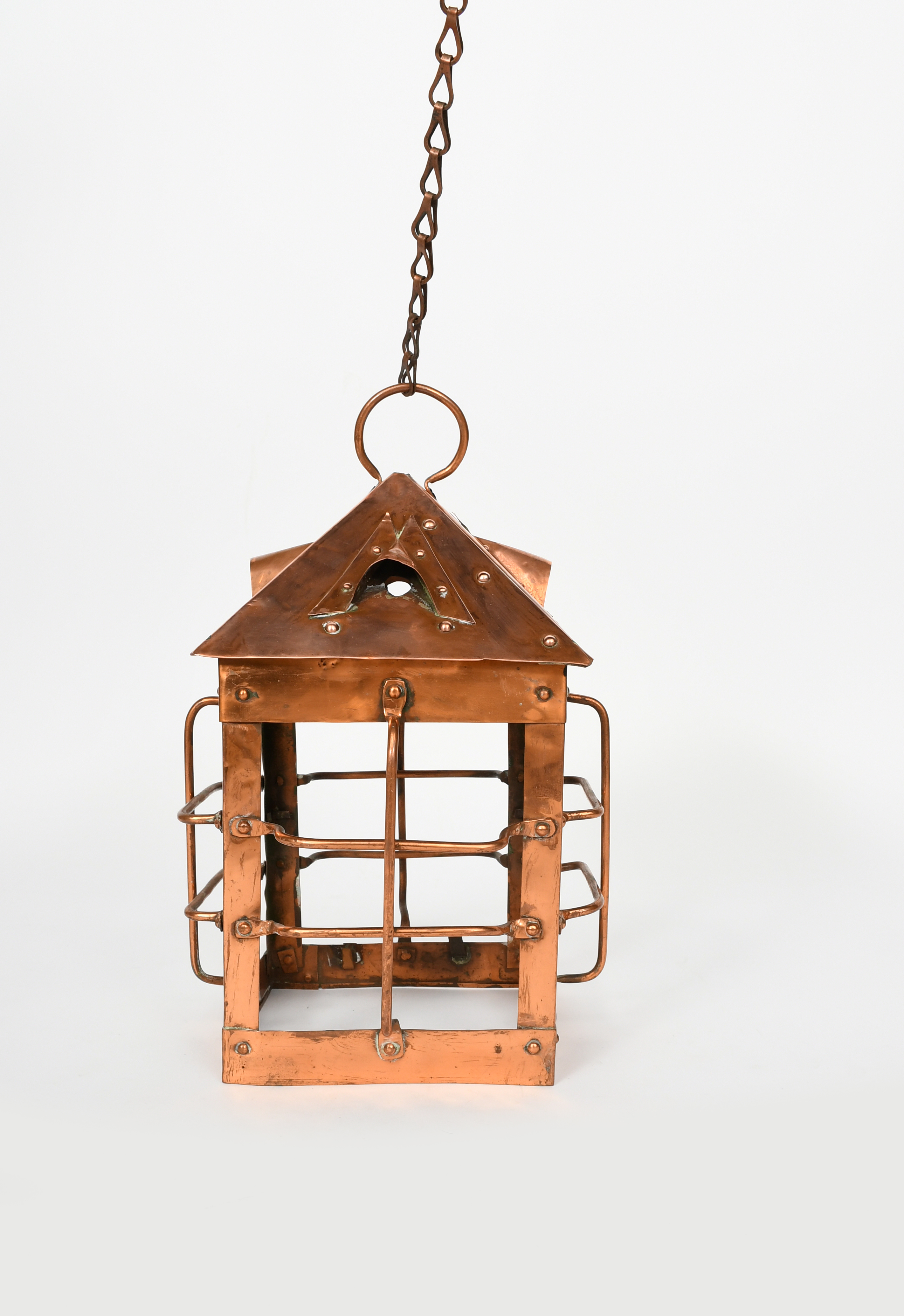 A polished copper hall lantern, square section with pitched top, decorated with simple rivets, set