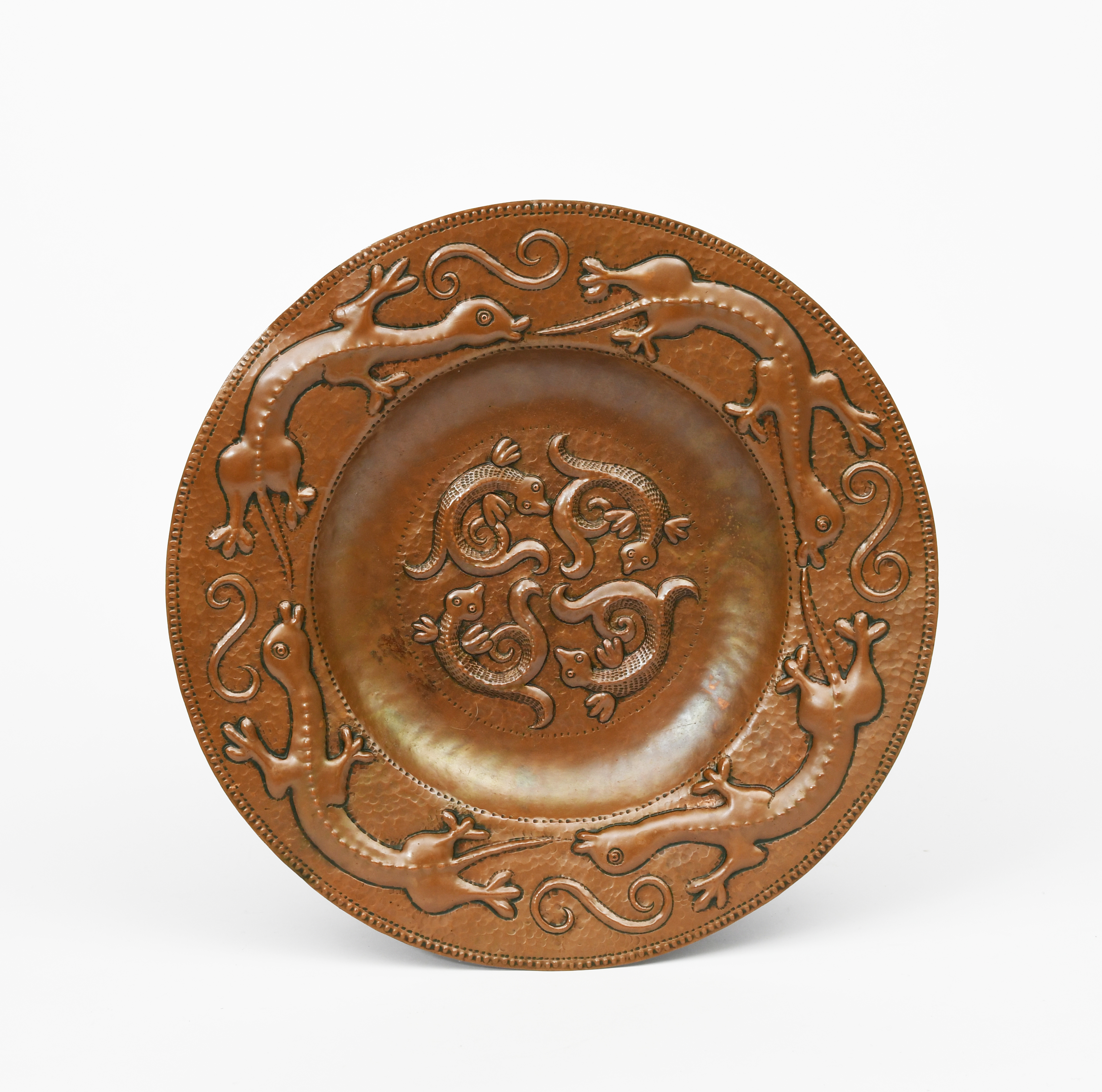 A repousse copper charger by John Pearson, dated 1899, circular, hammered in low relief with four lizard-like creatures to the well, the rim with a frieze of larger lizards, brown patina, etched J Pearson 1899, 2467, 36.5cm. diam.