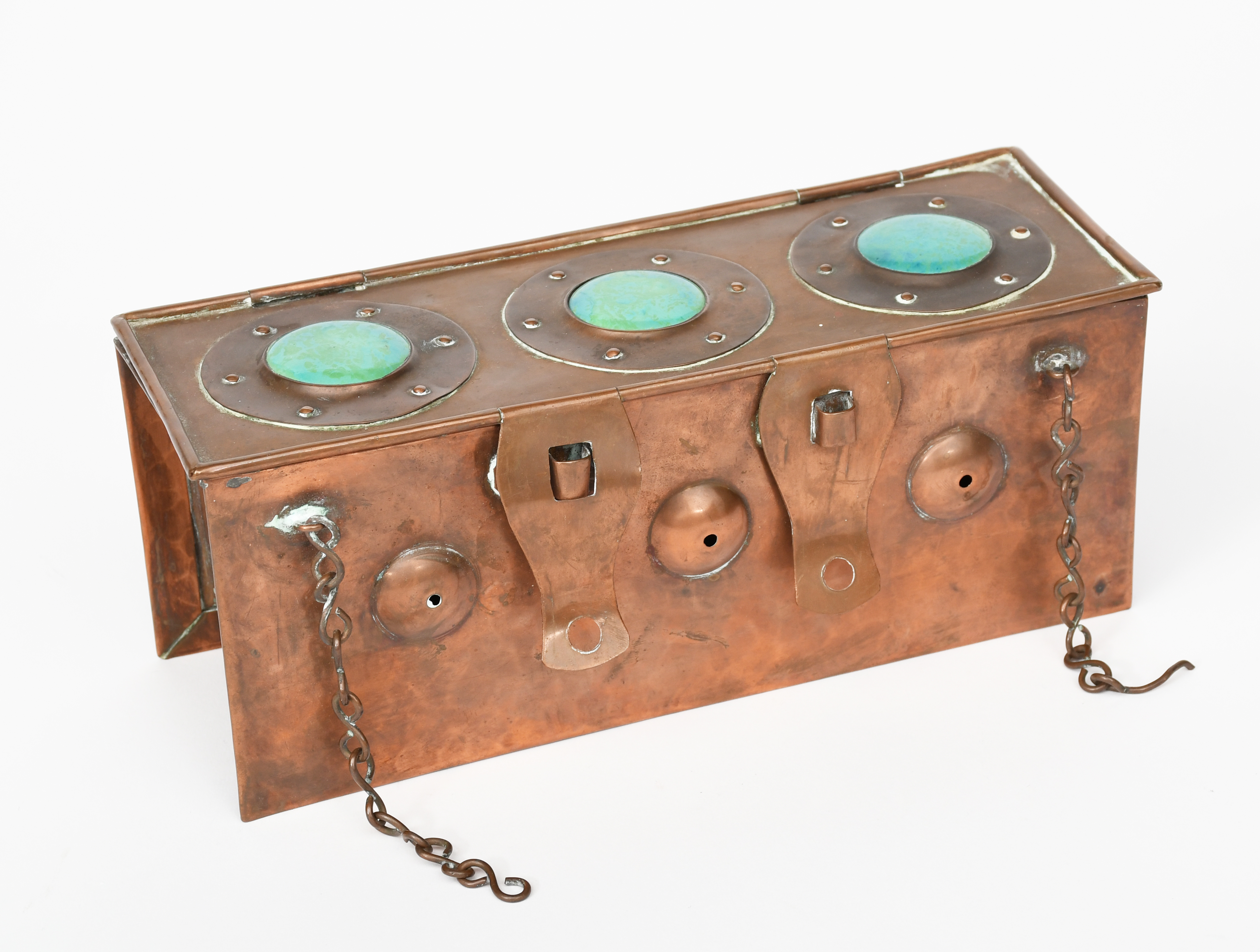 A Copper string box, rectangular with hinged cover, applied with three turquoise roundels, unsigned, 23.5cm. wide