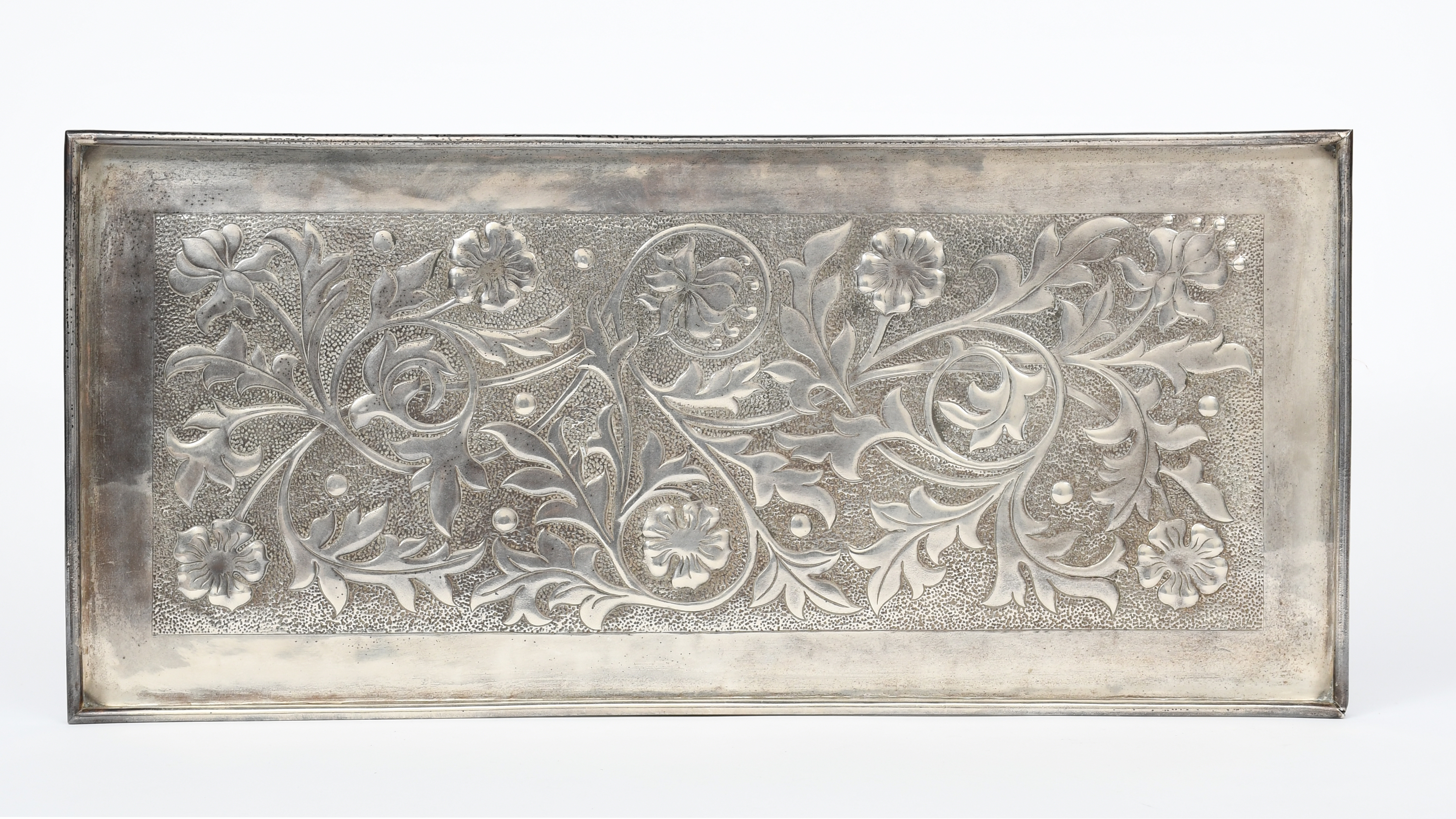 A rare Keswick School of Industrial Arts silver tray by Jeremiah Richardson, rectangular, hammered in low relief with scrolling flowers and foliage panel, etched Jeremiah Richardson and possible 1890 date to back, 54 x 24.5cm.