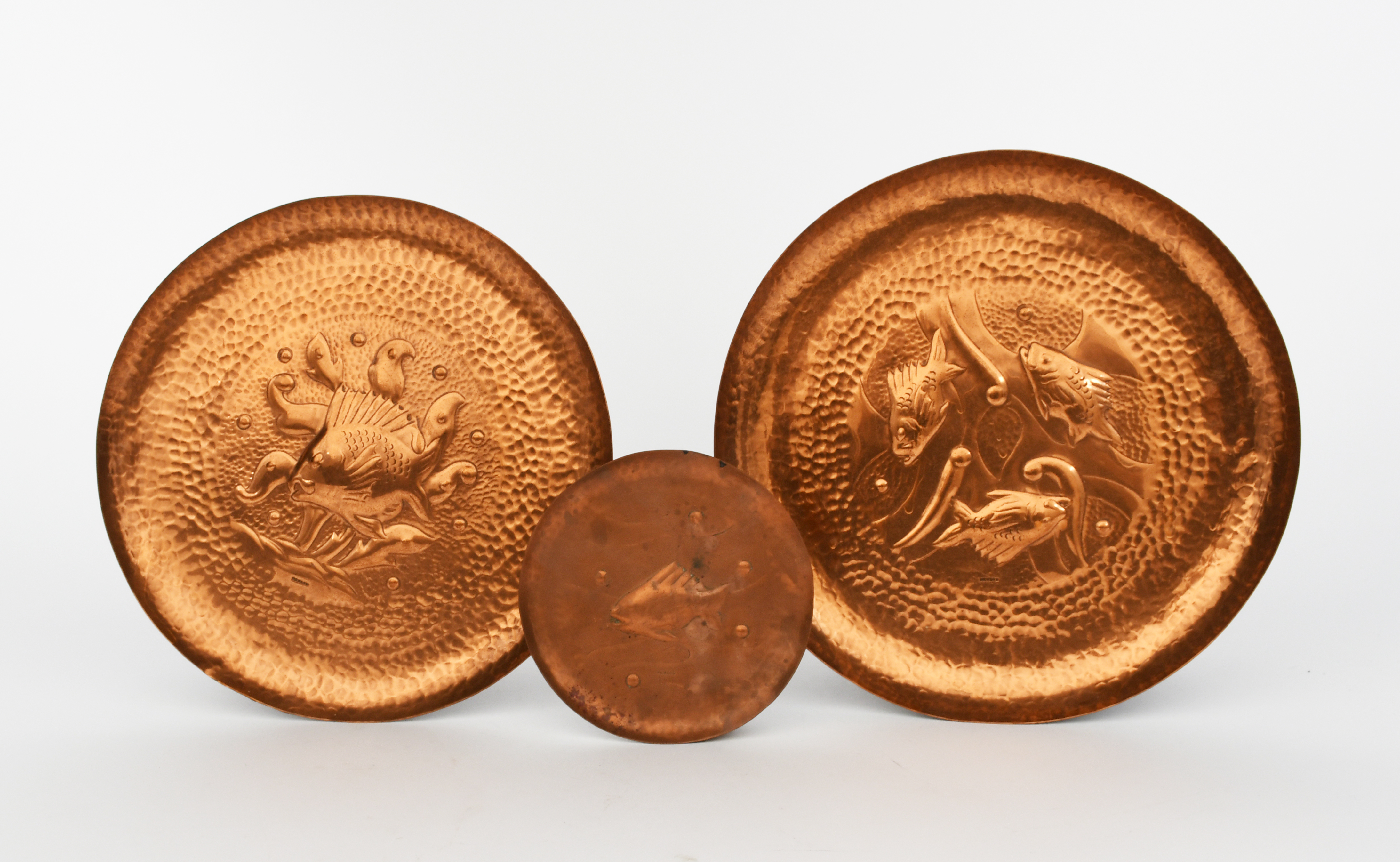 A Newlyn Industrial Classes copper plate, hammered in low relief with a large fish swimming amongst waterweed, on a hammered ground, another Newlyn plate with three small fish and a small Newlyn copper dish, stamped Newlyn, 25cm. diam. (3)