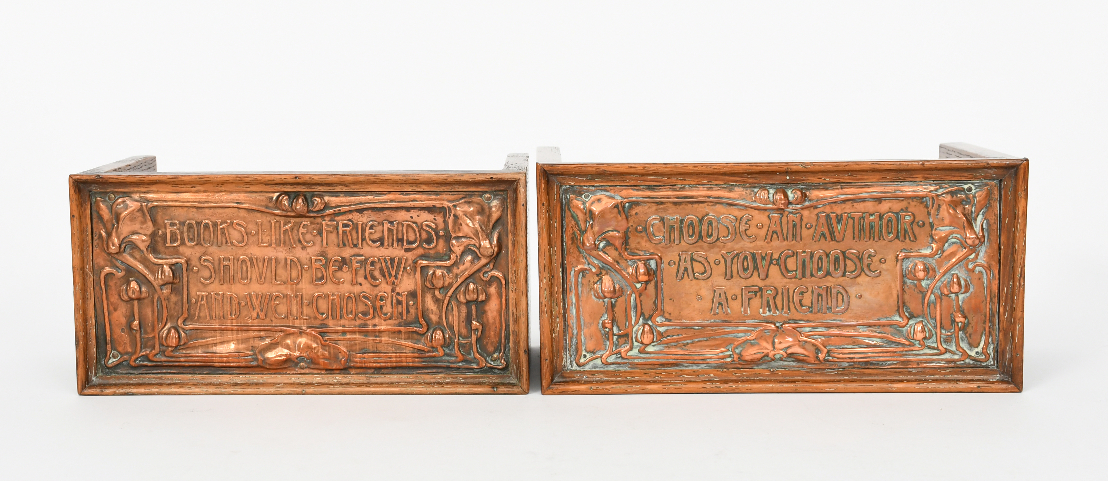 A pair of Shapland and Petter oak book stands, each rectangular applied with a copper plaque inscribed Choose an author as you choose a friend and Books like friends should be few and well chosen, unsigned 26cm. wide (2)