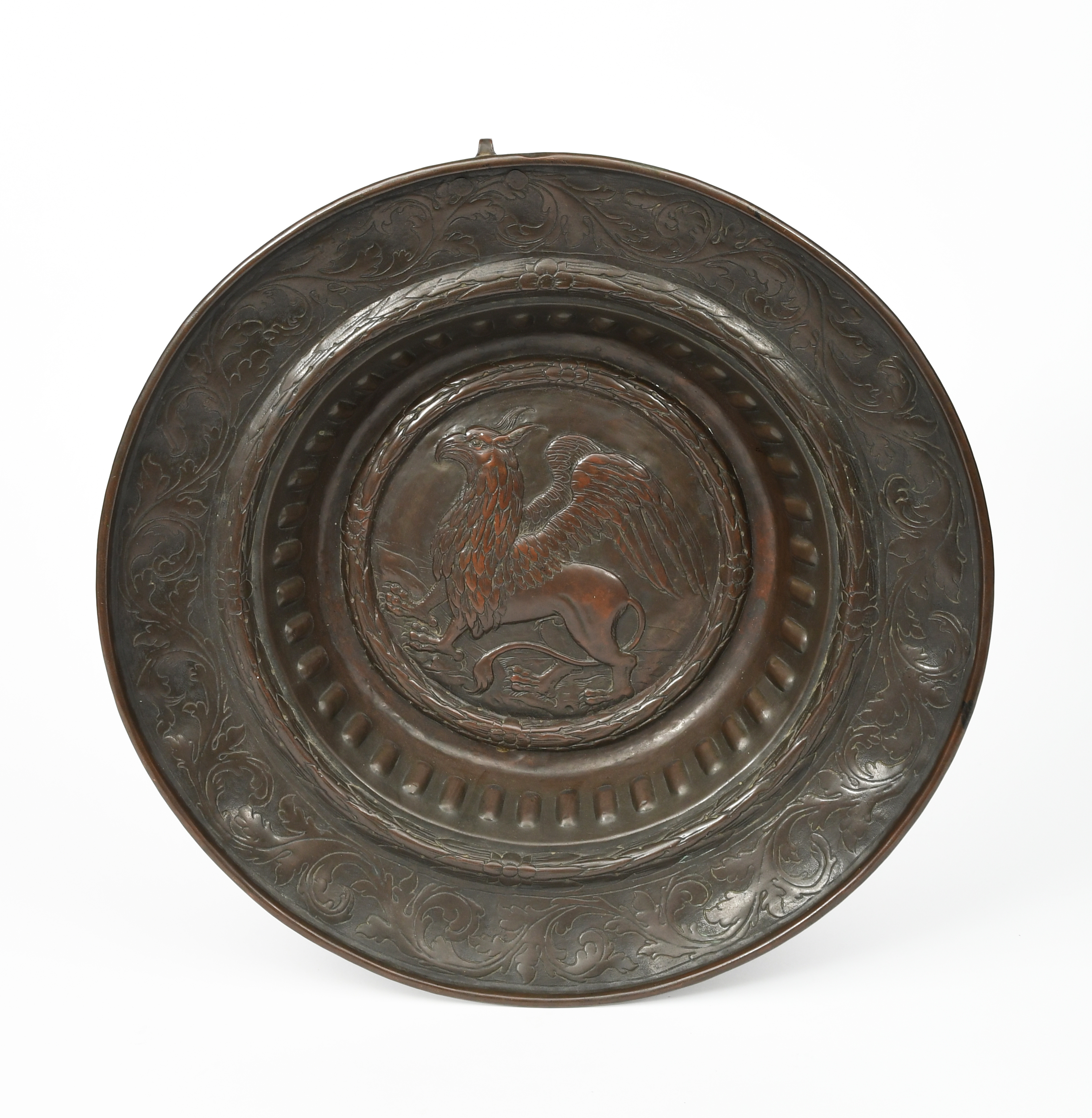 A large patinated copper Griffin wall charger, hammered in relief with a heraldic griffin to the well, inside laurel border, the rim with scrolling foliate frieze, unsigned, 48.5cm. diam.