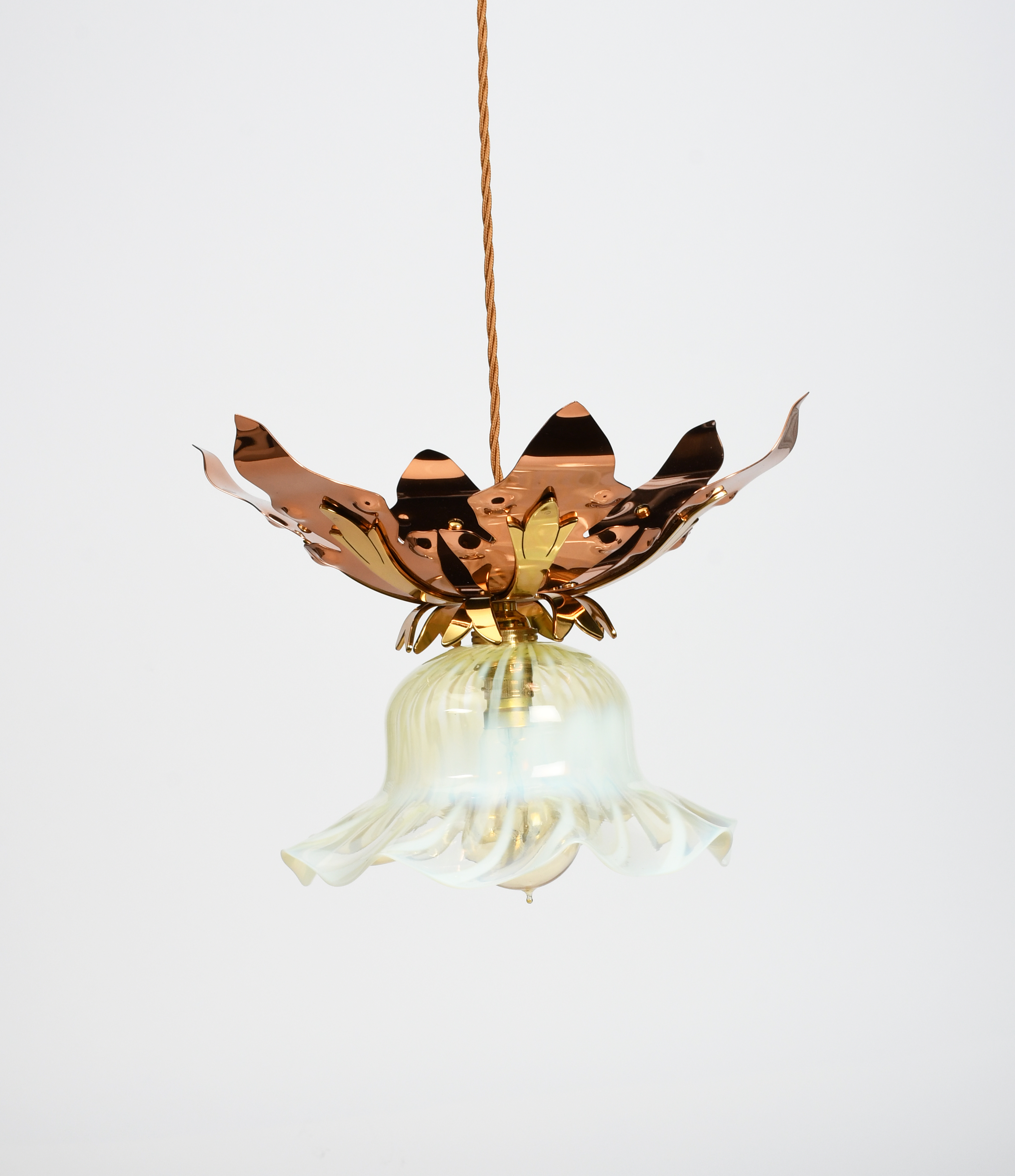 A modern copper and vaseline glass ceiling light by Christopher Vickers, originally designed by