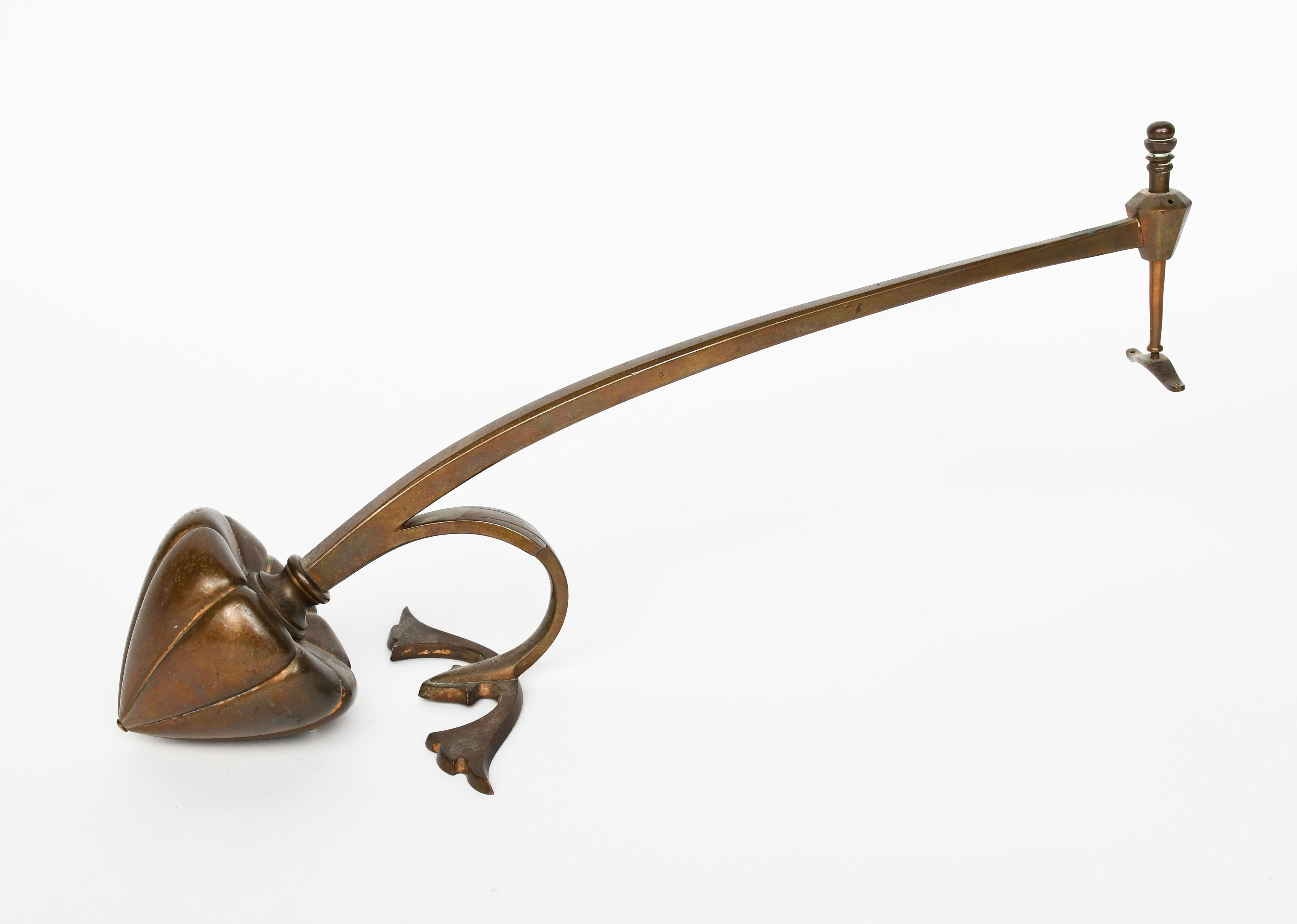 A WAS Benson patinated copper mantle screen holder, seedpod counterweight twin-foliate feet supporting tapering arm with fitting, stamped mark, 43cm. wide