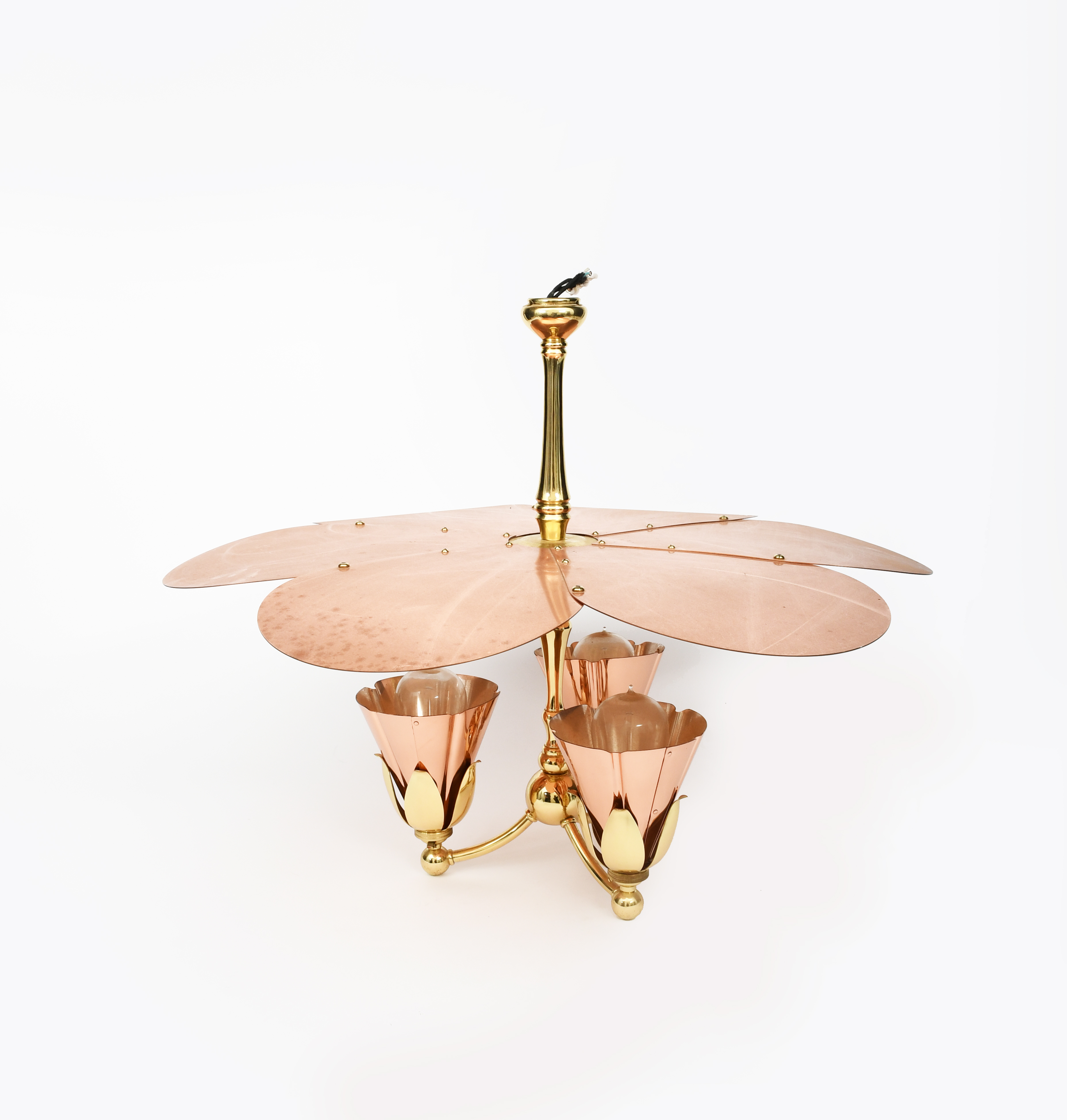A large modern copper and brass ceiling light by Chris Vickers, originally designed by the Birmingham Guild of Handicraft, large floriform copper reflector shade over three branch brass light fitting with copper cone shades, unsigned, 61cm. diam. 44cm high
