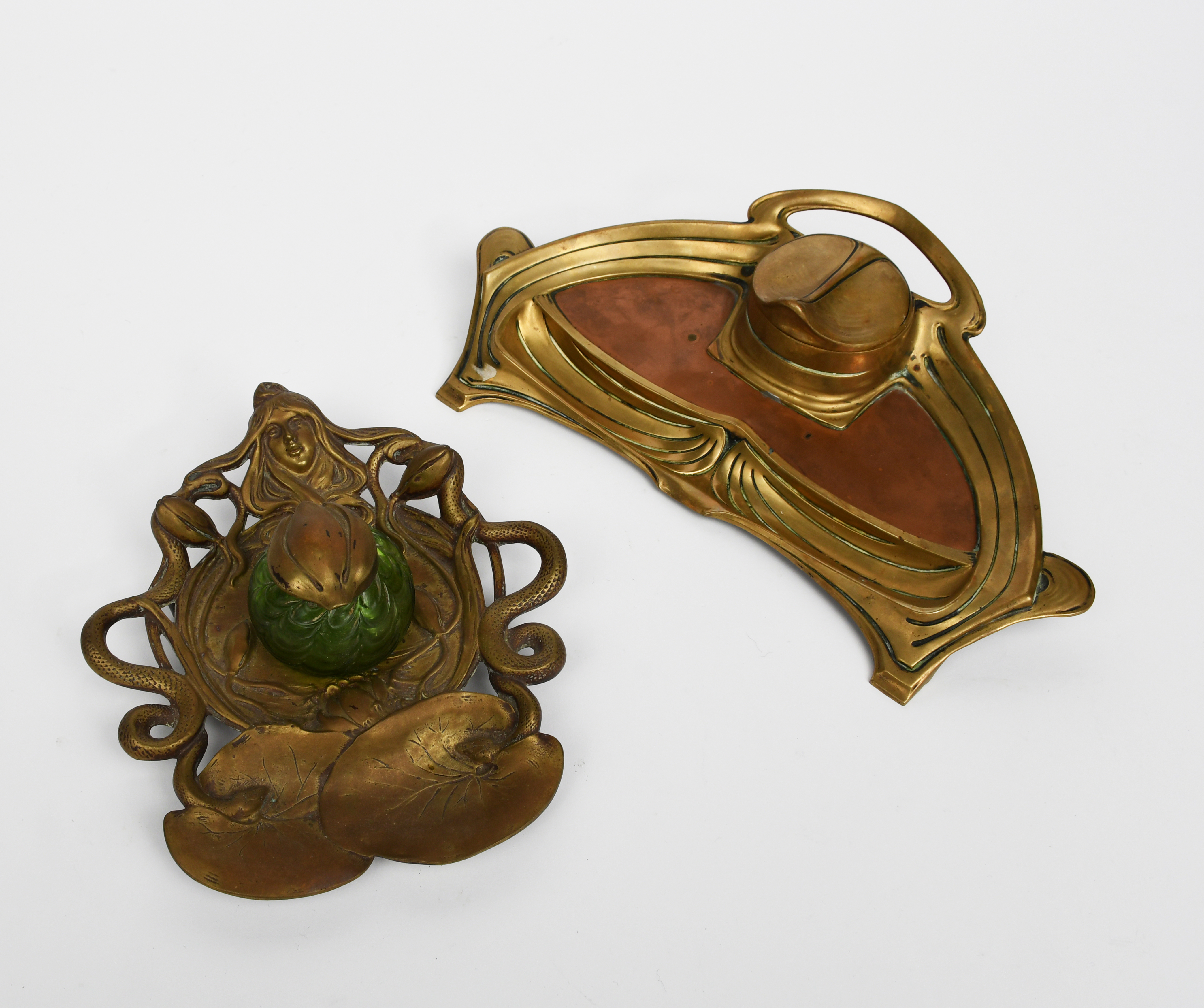 An Art Nouveau cast brass inkwell with Austrian iridescent glass well, in the manner of Gurschner, cast in low relief with a maiden amidst water-lily pads, another Jugendstil brass and copper inkwell, an Art Nouveau pewter and glass claret jug and an Art Nouveau electroplated biscuit box and cover with engraved glass liner, cast Geschlitz mark, 20.5cm. wide (6)