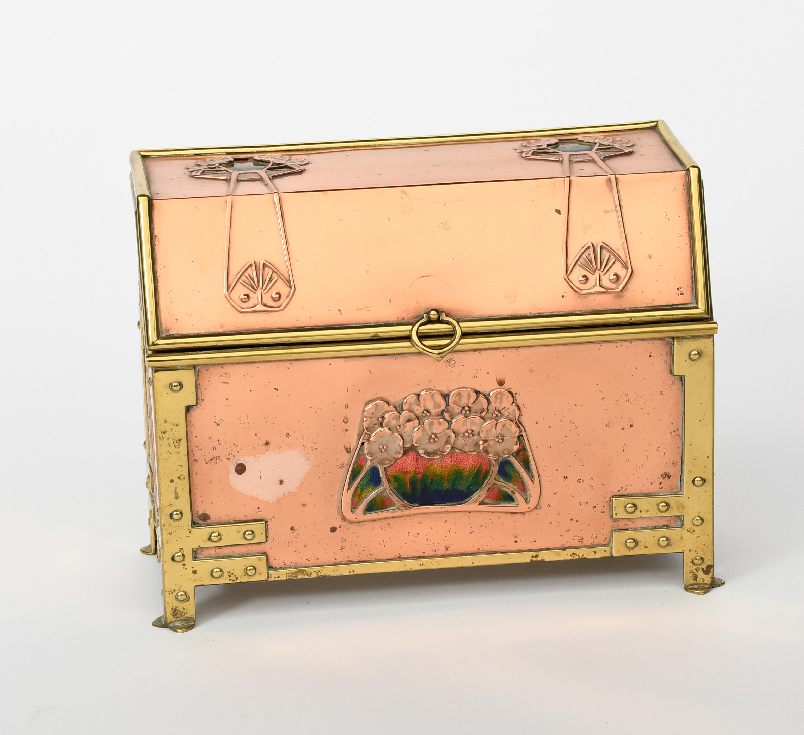A continental copper and brass Secessionist desk post casket, copper chest form with brass rivetted bands, with hinged cover, cast with panels of flowers set with coloured enamel panels, the interior fitted for paper and envelopes, unsigned 21.5cm. wide