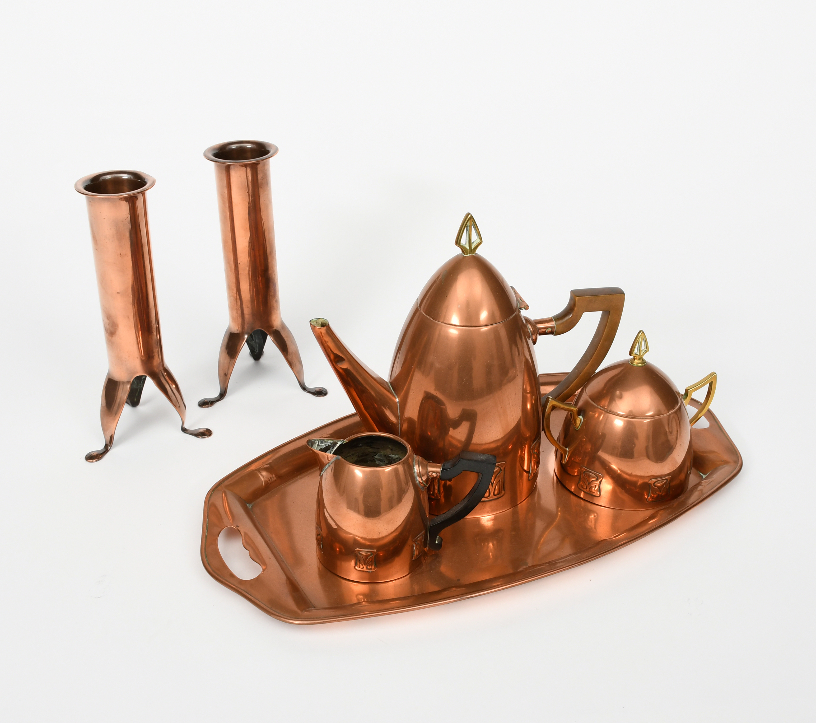 A WMF Secessionist copper and brass coffee set, comprising pot and hinged cover with bakelite handle, twin-handled sugar basin and cover, milk-jug and a twin-handled tray, with simple stamped motif, and a pair of copper tripod vases stamped Ostrich marks WMF set, 41cm. wide (tray), (7)