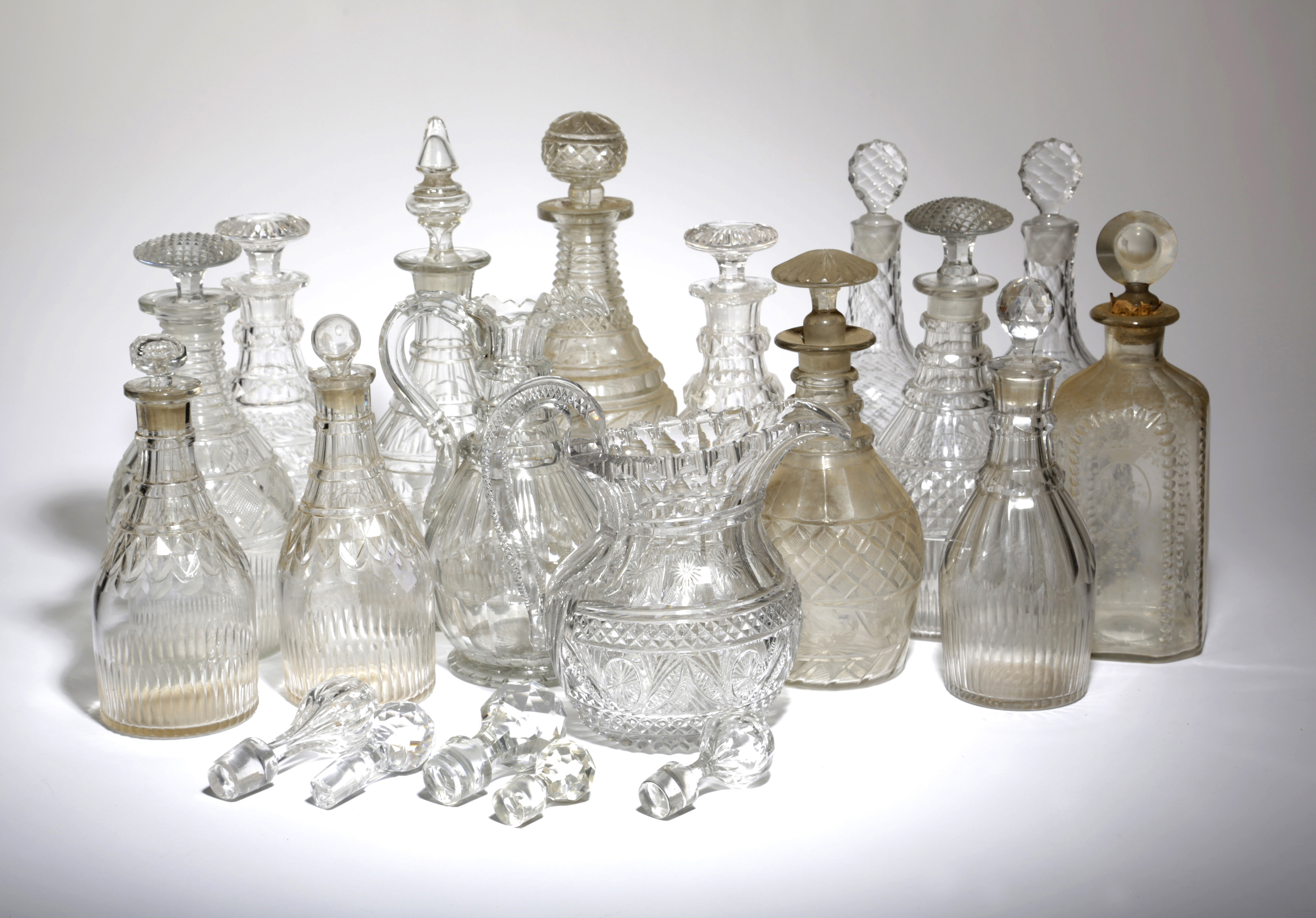 A COLLECTION OF GLASS DECANTERS AND STOPPERS