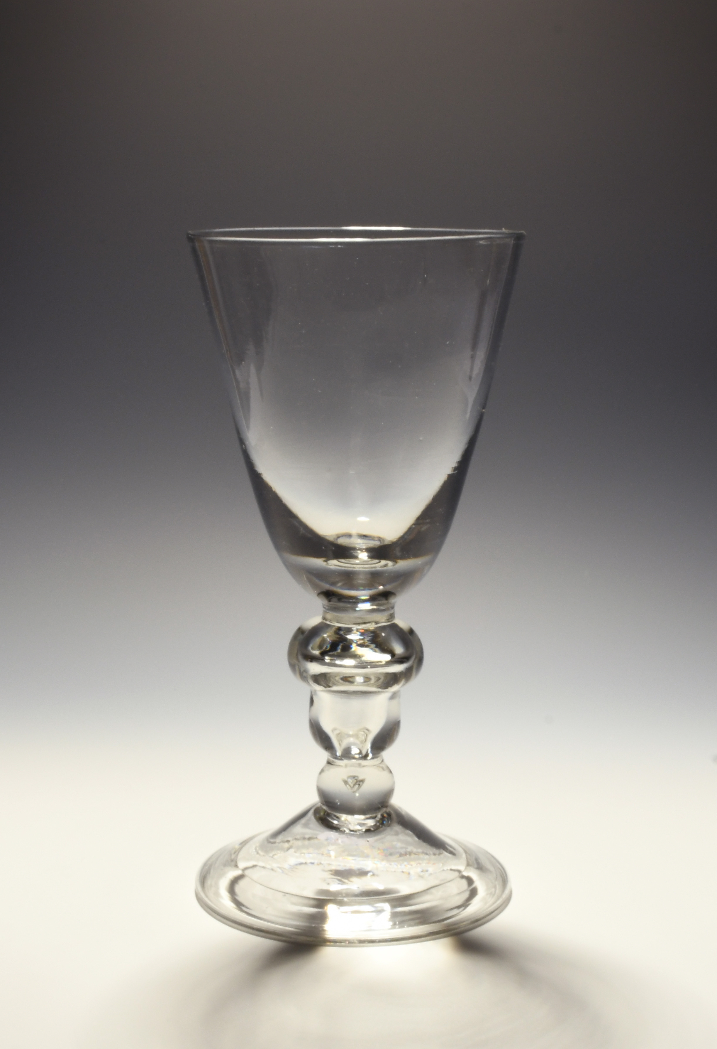 the generous round funnel bowl raised on a short baluster stem with large acorn knop over a basal ball knop, a folded conical foot