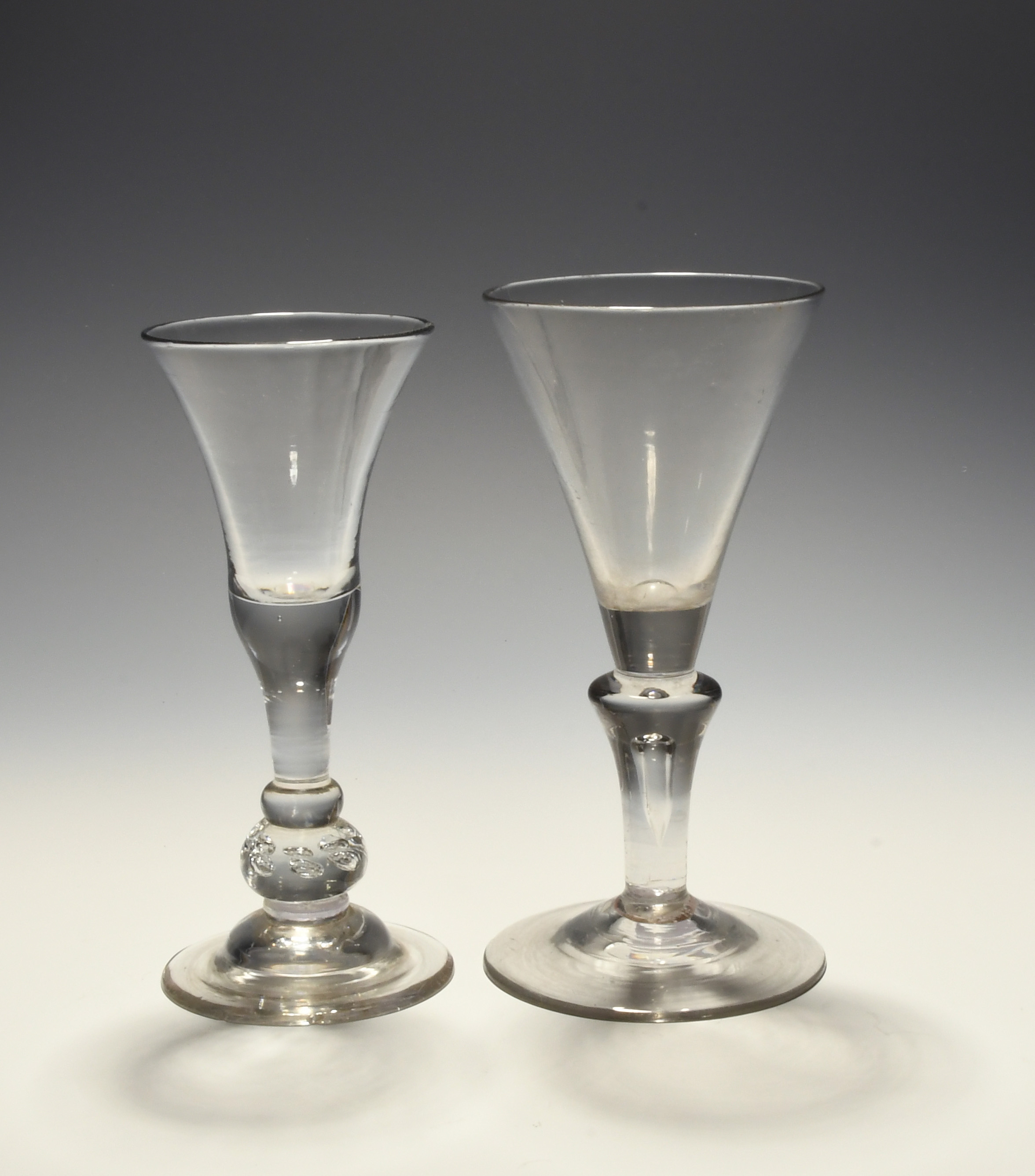 one with a bell bowl over a balustroid stem with flattened knops flanking a teared knop over a domed foot, the other with drawn bowl rising from a baluster stem enclosing a long tear (2)
