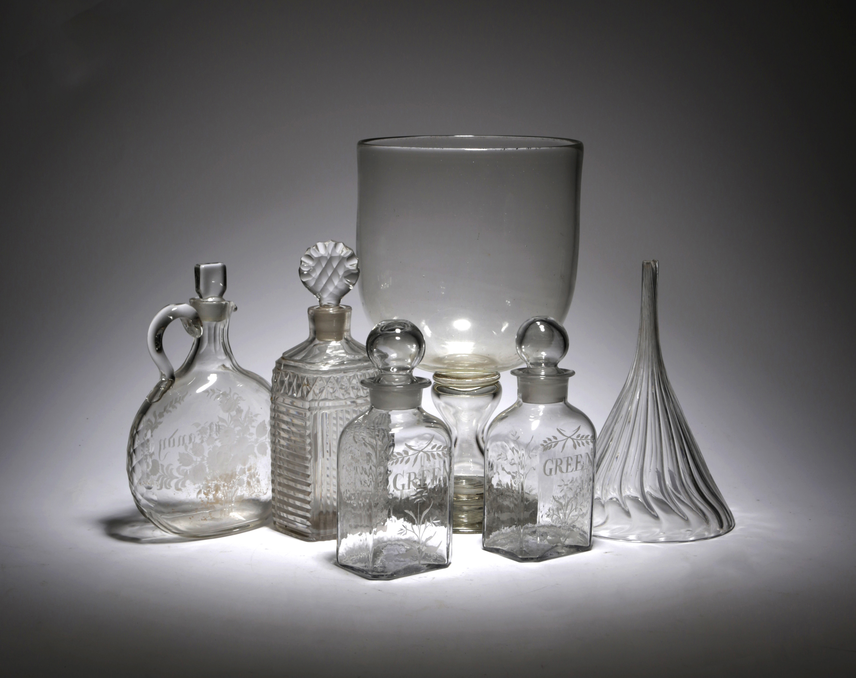 the rounded bowl on a hollow hour glass stem and spreading foot, together with a glass funnel with moulded, reeded decoration, a pair of decanters and stoppers, possibly Dutch, a moon flask decanter and stopper inscribed 'Brandy', and another decanter and stopper (7)