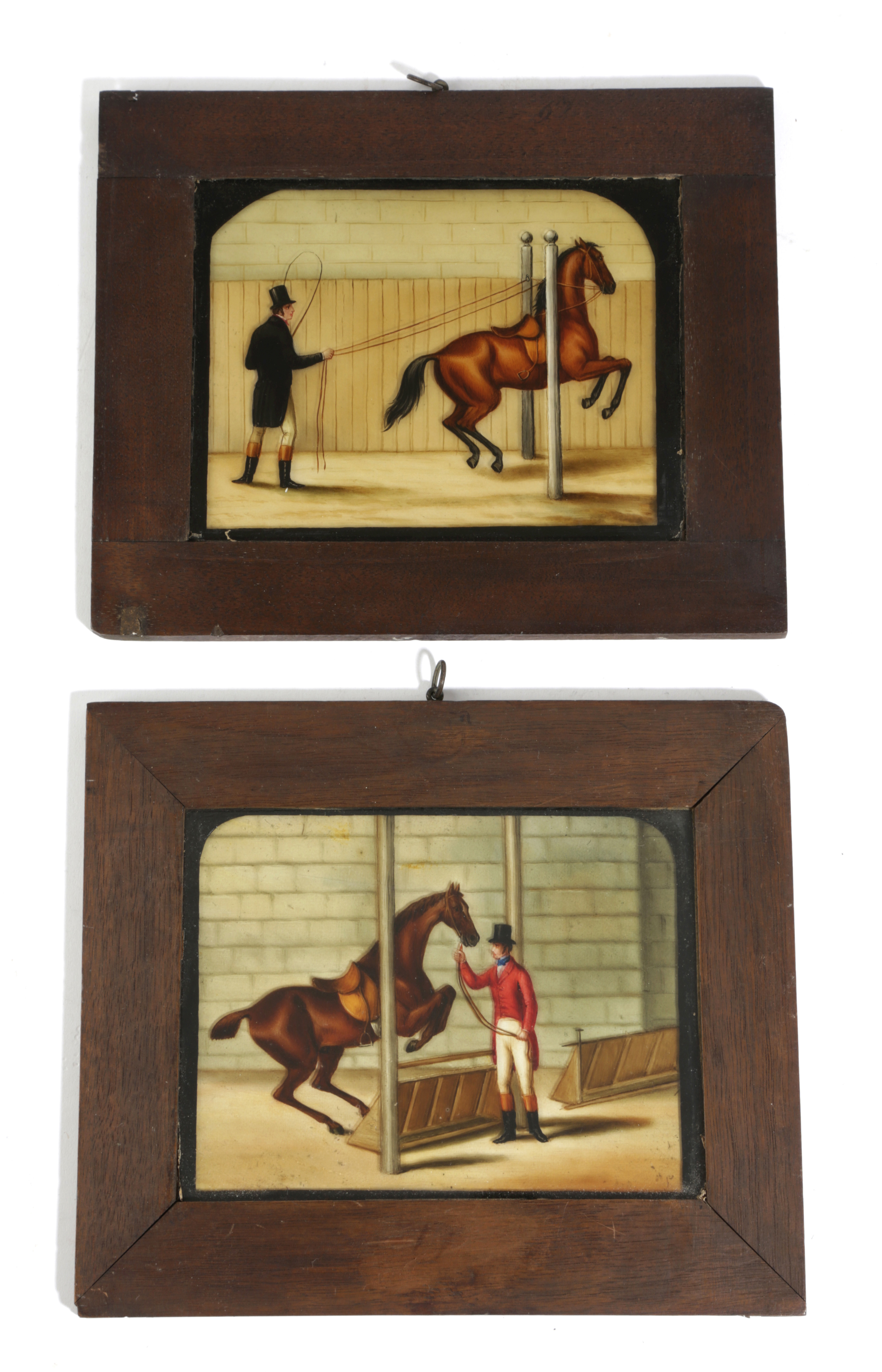 A PAIR OF EQUESTRIAN REVERSE GLASS PAINTINGS