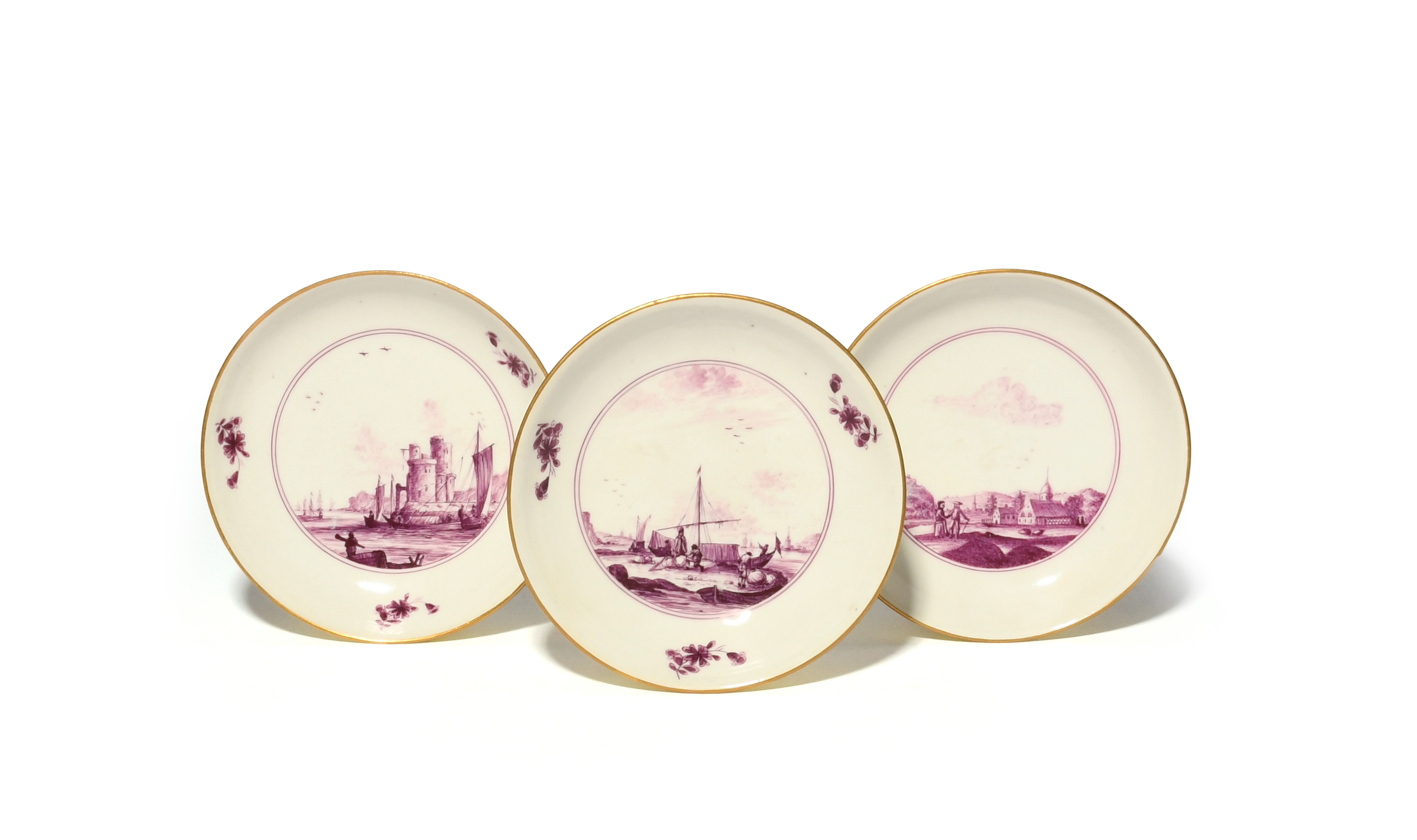 with purpurmalerei decoration of harbour scenes and figures in rural landscapes, two with small flower sprigs to the borders, the undersides decorated in a canary yellow, blue crossed swords marks, puce painter's marks to two (3)