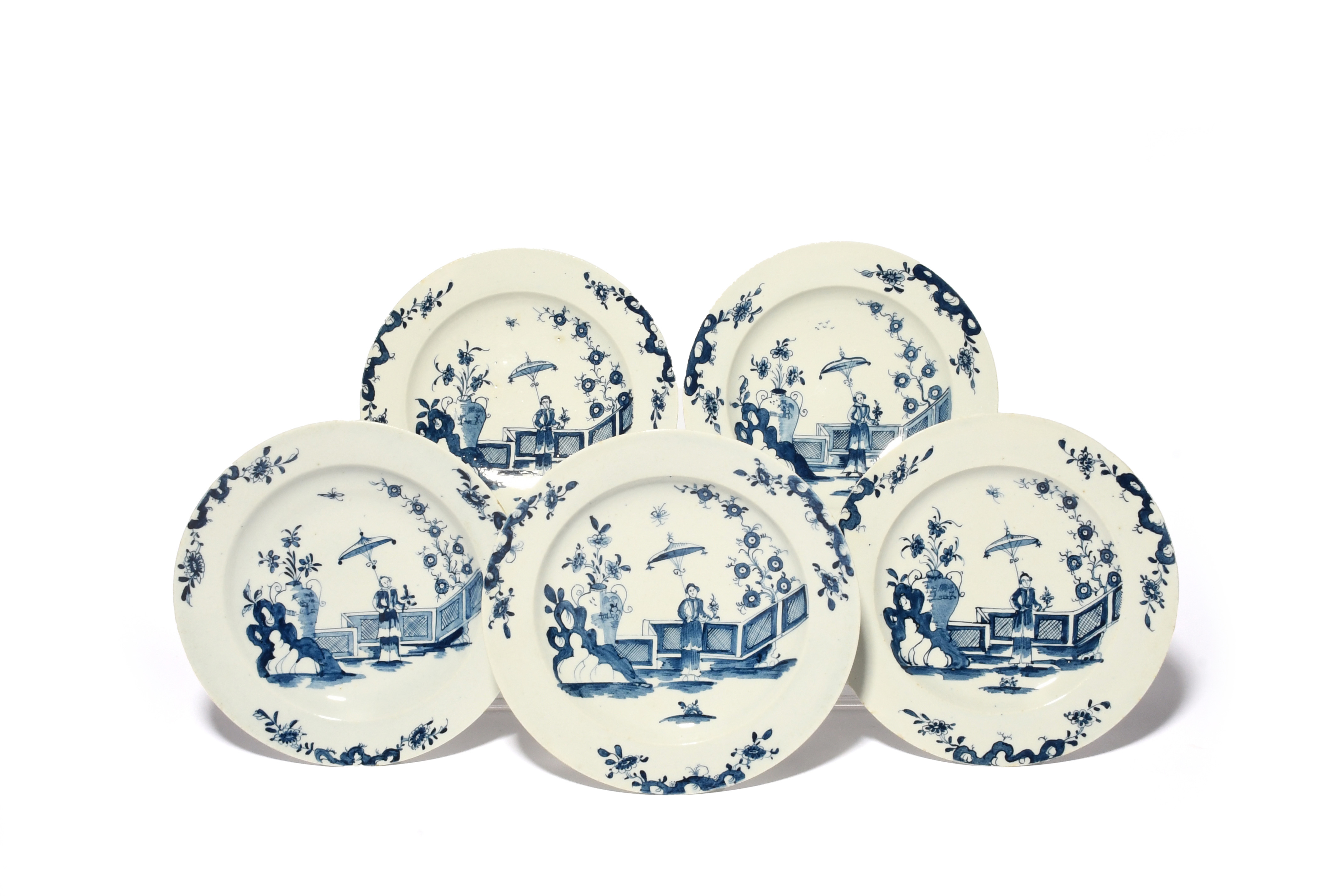 each painted with a Chinese figure holding an elaborate open parasol, standing before a zigzag fence, flanked by a tall vase and flowering plants, the rim with three vignettes of prunus issuing from rockwork (5)