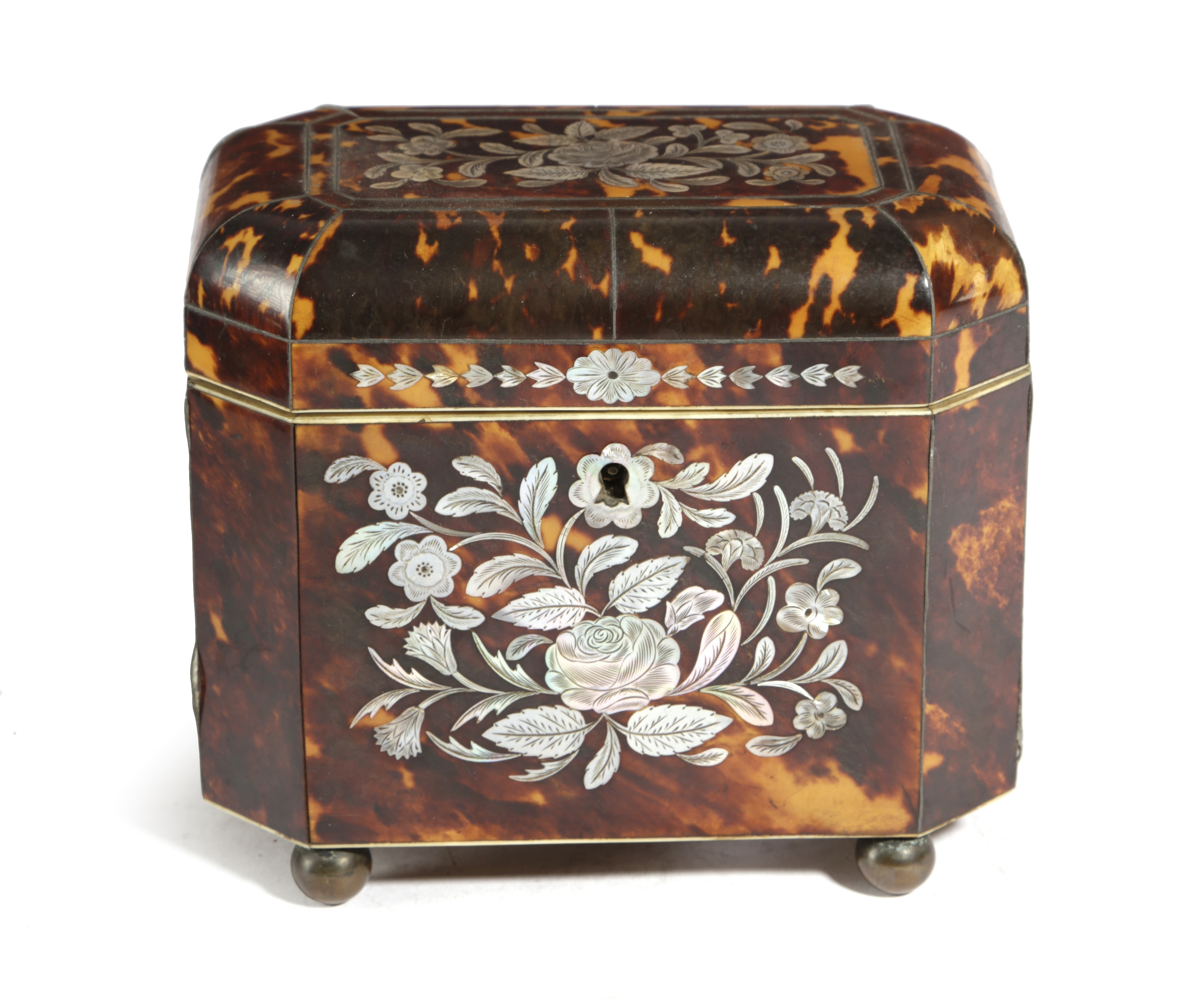 λ A REGENCY TORTOISESHELL AND MOTHER OF PEARL TEA CADDY