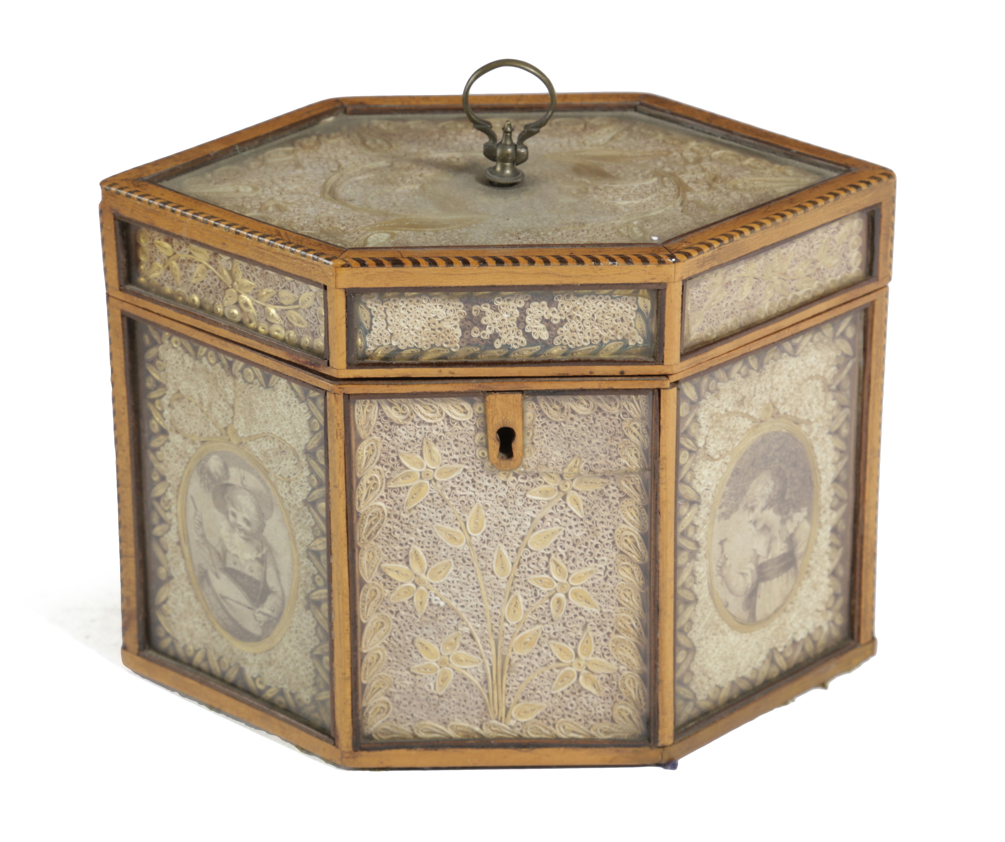 A GEORGE III SATINWOOD AND ROLLED PAPER TEA CADDY