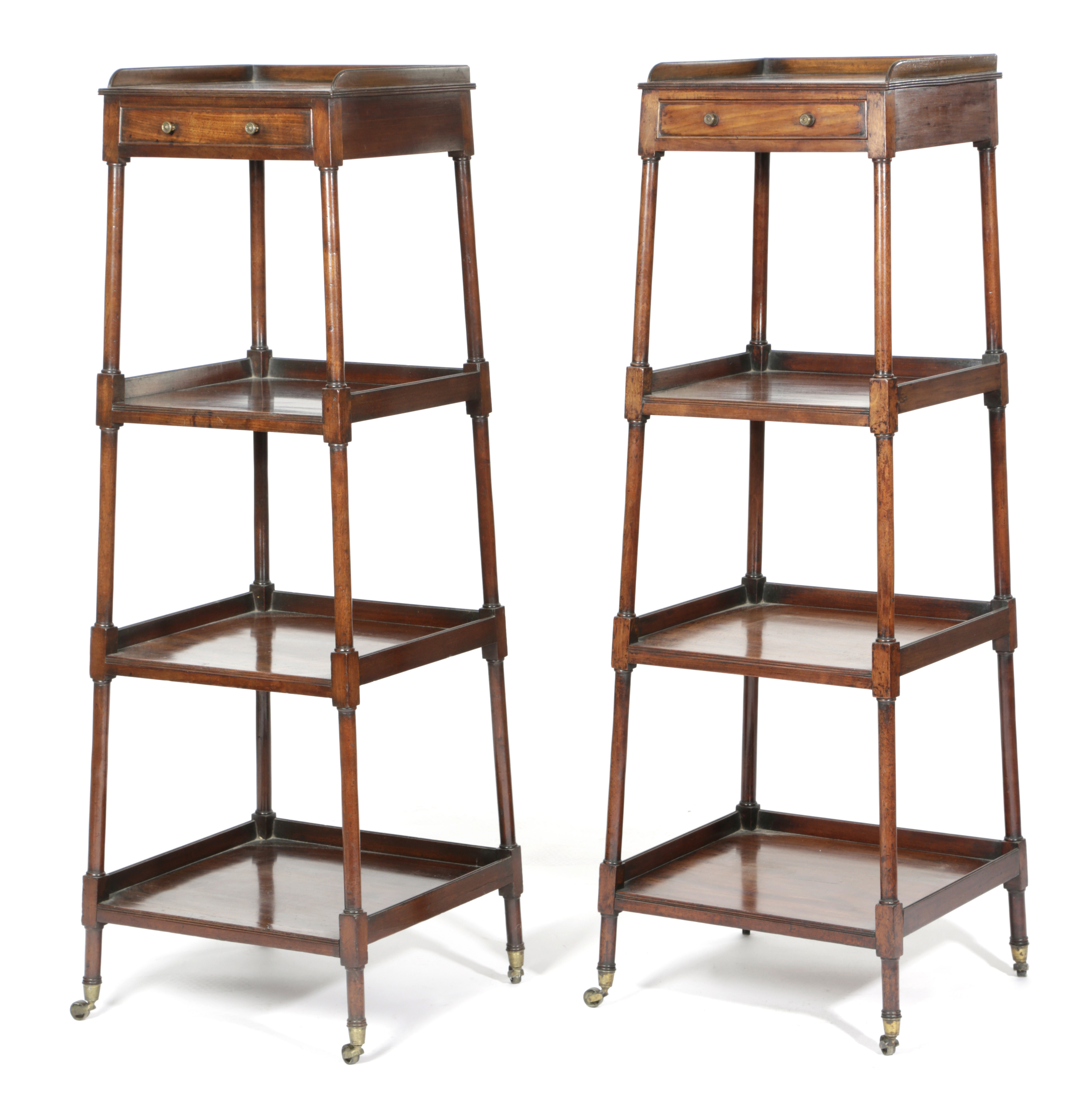 A RARE PAIR OF LATE GEORGE III 'OBELISK' WHATNOTS
