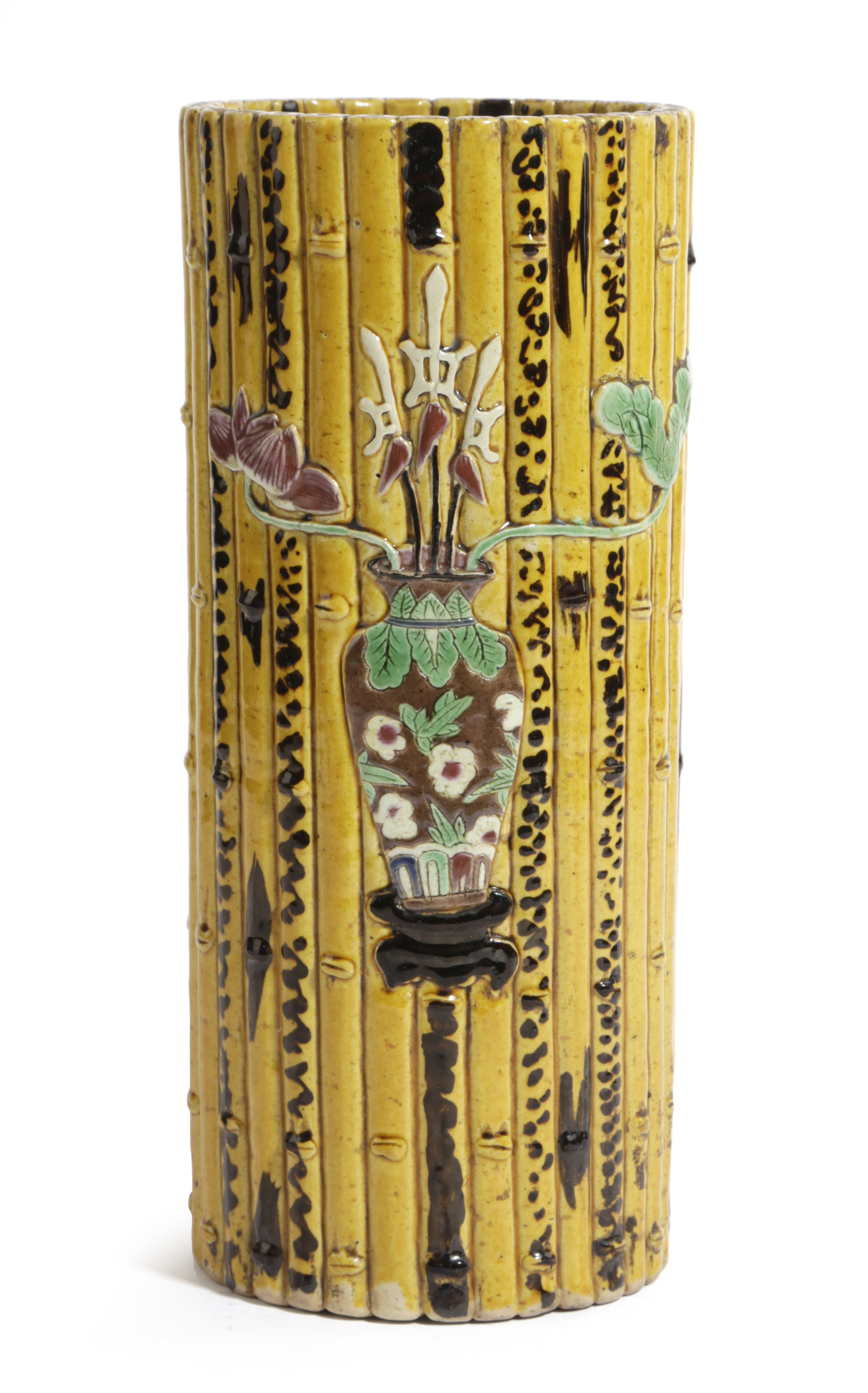 A CHINESE FAUX BAMBOO YELLOW GROUND VASE