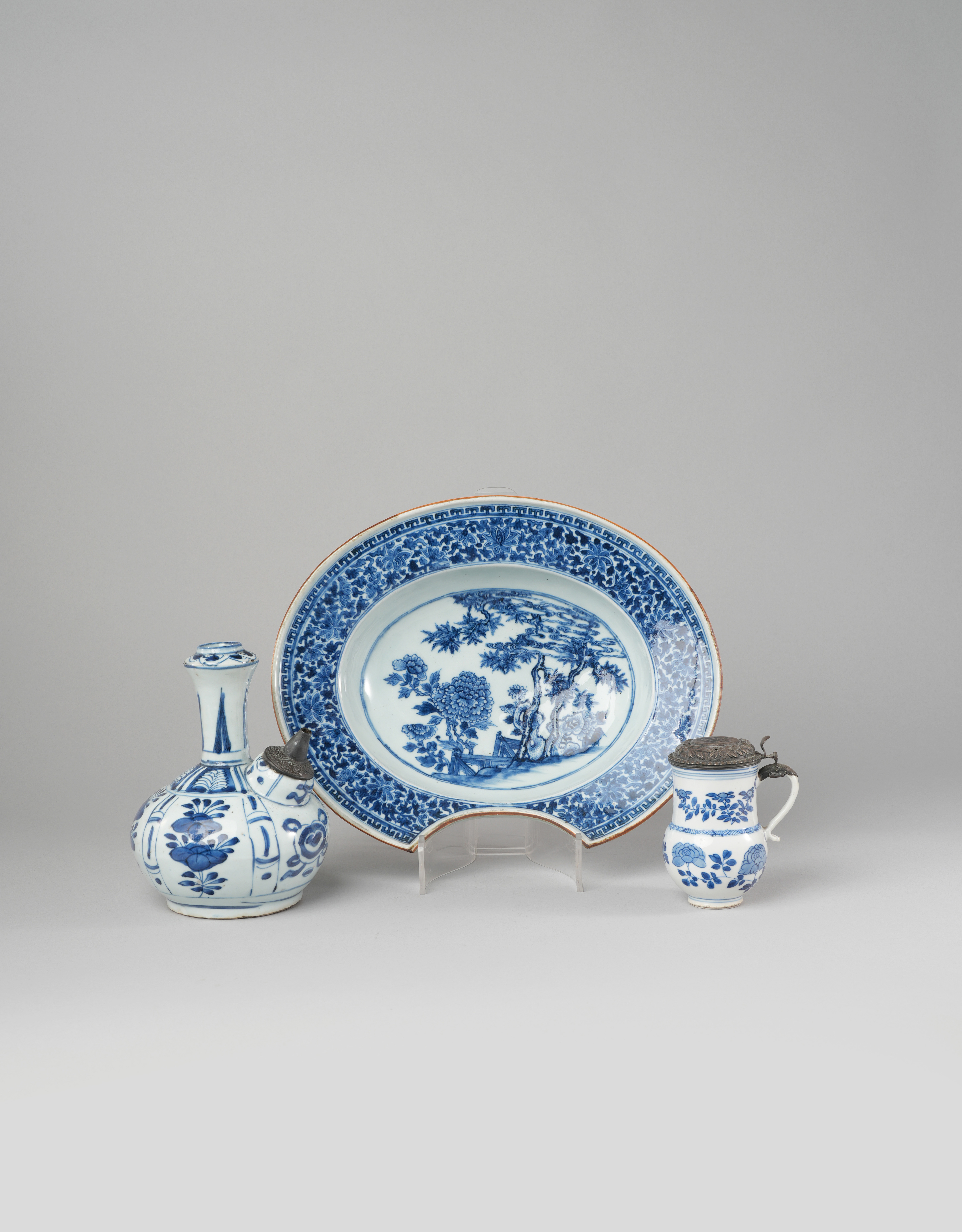 together with a Chinese blue and white shaving bowl, 18th Century, and a Kangxi blue and white tankard with a white metal cover (3)